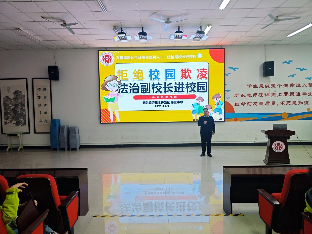 为了进一步增强学生法治意识和法律素质,推动学校法治教育深入开展,引导学生学法、守法,营造平安、文明、和谐的校园环境,2025年11月21日下午,烟台经济技术开发区第三小学精心谋划,特别聘请行致远律师事务所律师进行了法治副校长法治教育宣讲活动。学校王艳青校长及师生代表等全程参会。