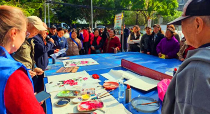 书画展区悬挂着5余幅长者作品:有苍劲有力的书法,也有色彩明快的山水图。现场创作区,76岁的王爷爷正挥墨画出两组不同风格的国色牡丹,赢得大家的阵阵喝彩。他告诉围观的居民:“我退休后才开始学国画,每天练习两小时,这不仅是爱好,更是我与自己对话的方式。”社工协助王爷爷将作品展示在展板上,一位年轻妈妈带着孩子驻足观看:“爷爷画得真好!以后我也要让孩子多向长辈学习。”