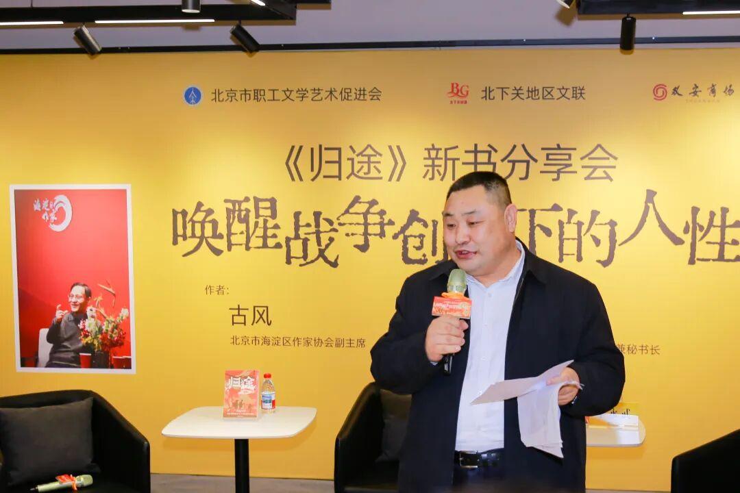 活动主持人王永武首先介绍了与会作家、评论家等重要嘉宾,对他(她)的到来表示欢迎和感谢。邀请古风老师作为特聘讲师为北京职工文学艺术 创作室落地北下关街道双安商场后分享第一课,为职工文艺创作系列活动开了一个好头,奠定了好的基础。他介绍说,作为一部以二战期间香港战场为背景的长篇小说,《归途》自从10月份出版以来,便以独特的叙事视角、鲜活的人物群像和深刻的人性思考,引发了文学界和读者的广泛关注。作品以美军飞行员诺亚的逃亡与营救为主线,勾勒出香港沦陷时期东江纵队港九大队及香港普通民众的英雄群像,让我们在烽火硝烟中看到了平凡人身上闪耀的人性光辉。这部作品的诞生,离不开作者古风先生近三十年的深耕与沉淀。
