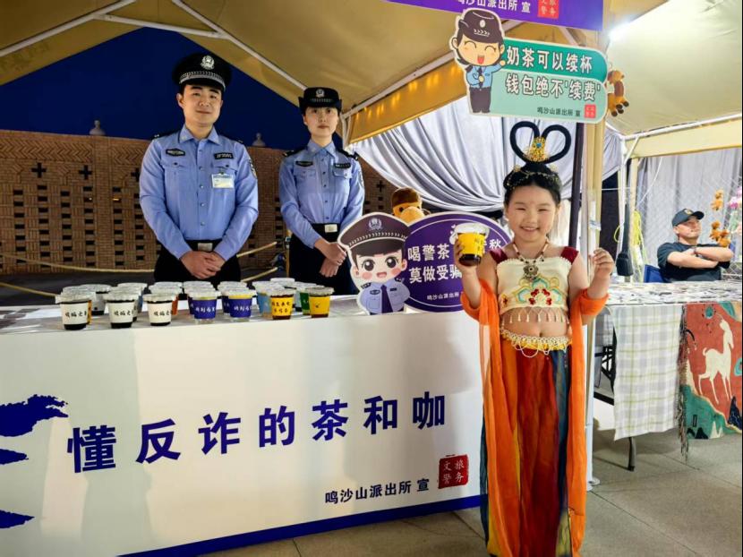 在酒泉,安全宣传正以轻盈巧思融入旅途。步入敦煌夜市的“反诈警‘茶’”,游客李先生点了一杯“不上当拿铁”,杯身上的“客服索要验证码吗?这杯苦瓜汁送他!”标语让他会心一笑;“反诈主题超市”里,文创产品与安全标语相映成趣,一枚枚加盖的“反诈印章”成为可收藏的“旅行印记”。这些充满巧思的“反诈周边”,与街头巷尾具有飞天元素的交安设施,成为“文旅警务”独特的宣传风景线。
