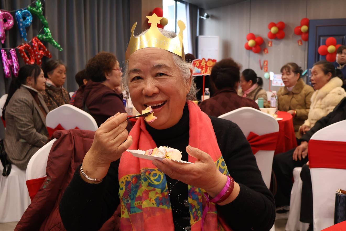 随后,领导与嘉宾为老人们送上包含保温杯、牛奶、食用油的“暖心包”,传递“手握恒温,心怀长暖”的美好祝愿。在悠扬的《生日快乐》旋律中,寿星们头戴生日帽,共同许愿、吹灭蜡烛,分享甜蜜蛋糕,幸福的笑容洋溢在每一位老人的脸上。