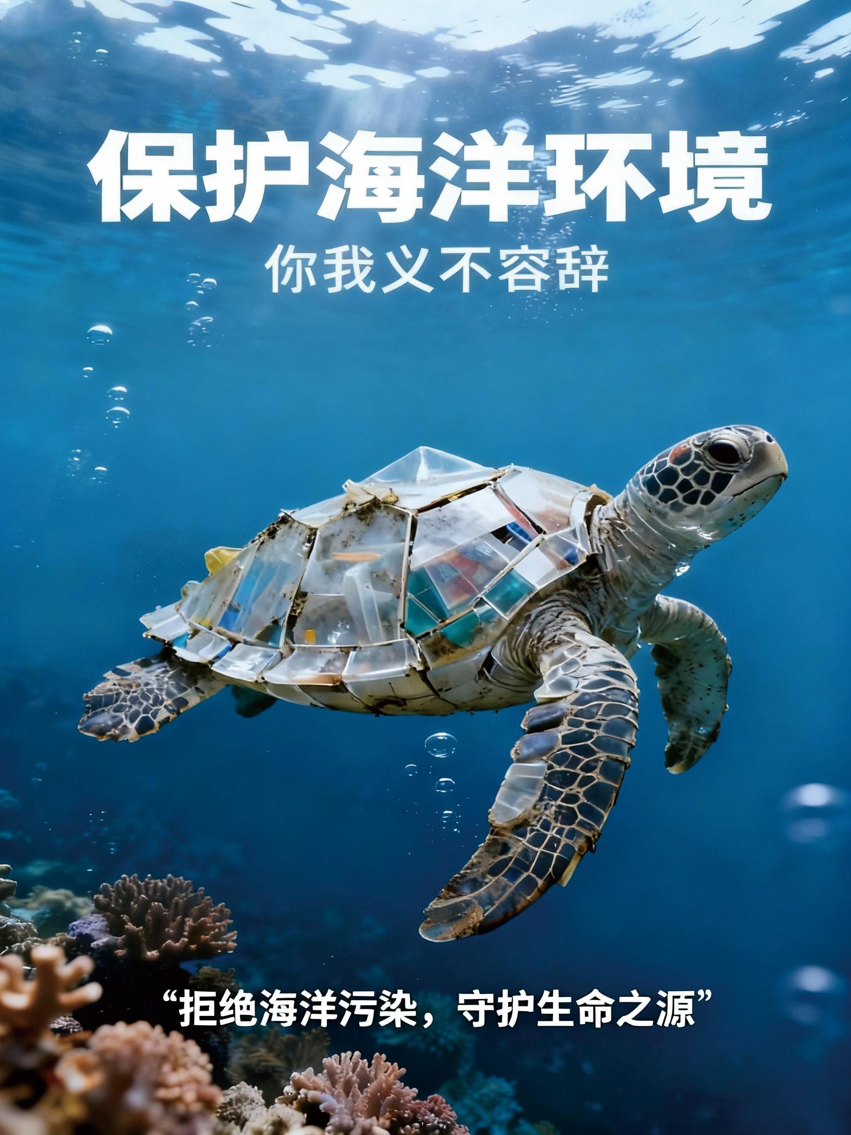 在以海龟为主题的海报中,一只海龟正艰难地在海水中挣扎,它的四肢被废弃的塑料渔网紧紧缠绕,渔网深深嵌入它的皮肤,周围是各种漂浮的塑料垃圾。海龟的眼神中充满了痛苦和无助,它的每一次挣扎都显得那么无力。这个画面并非虚构,而是现实中无数海龟命运的缩影。在现实海洋中,每年都有大量海龟因被渔具、塑料绳缠绕,导致肢体残疾,无法正常游动和捕食,最终因饥饿、感染或溺水而死亡。据统计,全球超过 的海龟都曾遭遇过塑料垃圾的威胁 ,海龟的生存状况岌岌可危。