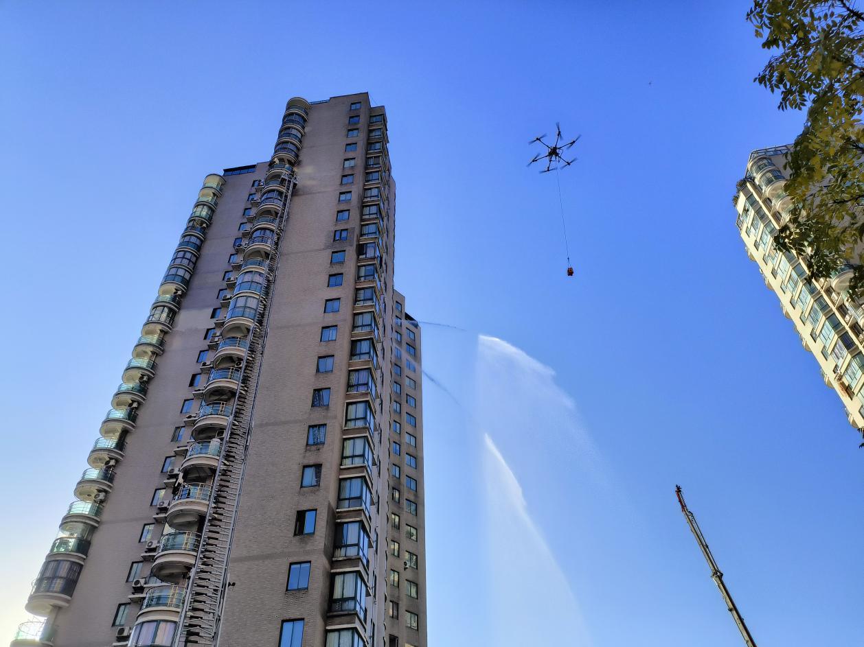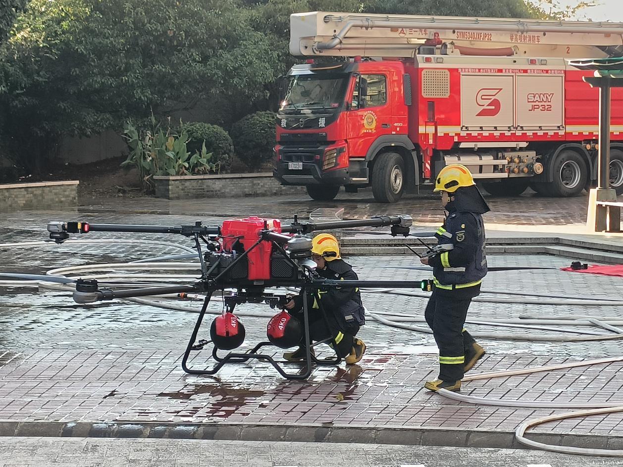 现场演练模拟小区内一栋高层住宅突发火情,楼内有居民被困。随着警报响起,消防队员迅速展开救援。随着刺耳的警报声划破天空,消防队员们迅速集结,展开立体化救援。高达数十米的云梯车如钢铁臂膀伸向高空,成功将被困人员安全转移;高压水枪从地面喷出两道水龙,精准射向“着火点”;最引人注目的是消防无人机升空,灵活飞抵高层窗口实施喷水作业,展现了科技消防的力量。