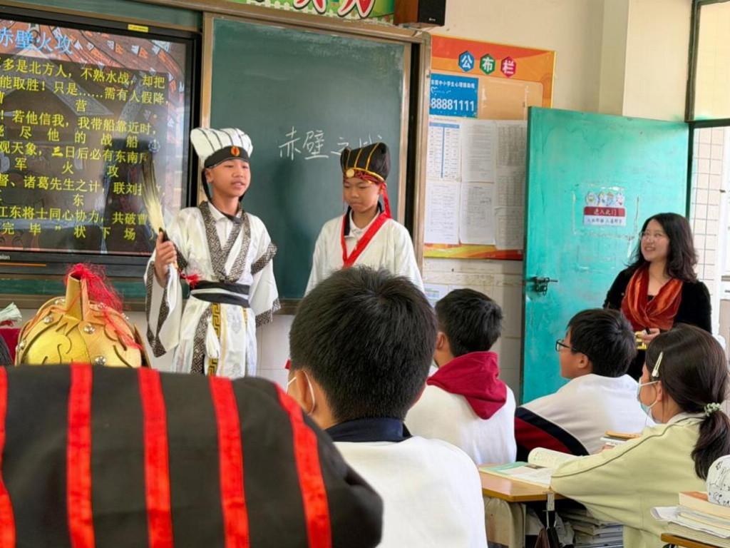 “历史不是故纸堆里的符号,而是能亲身‘踏入’的过往。”这是孙翊伦的教学信条。她始终坚信,历史课的真谛在于“生动而深刻”——“生”是还原鲜活的历史存在,“动”是激活师生的身心参与,而二者最终要指向建构主义倡导的“意义构建”,即让学生在沉浸式体验中触摸历史本质。针对初中历史“史实抽象、记忆枯燥”痛点,她耗时近一月打磨视导课,用情境搭建通往历史现场的阶梯。课堂开篇,剪辑版《三国演义》片段搭配汉乐府《蒿里行》,瞬间抓住学生注意力,让他们直观了解东汉末年社会状貌;三幕情景剧层层递进,“官渡对峙”的战略博弈、“赤壁对决”的火攻智慧、“三分鼎立”的治国辩论,鼎立局面形成后,“曹丕”“刘备”“孙权” 的登场,清晰呈现了“局部统一”的历史格局,让学生在角色扮演中理清时间脉络(220 年魏、221 年蜀、229 年吴)与核心史实。