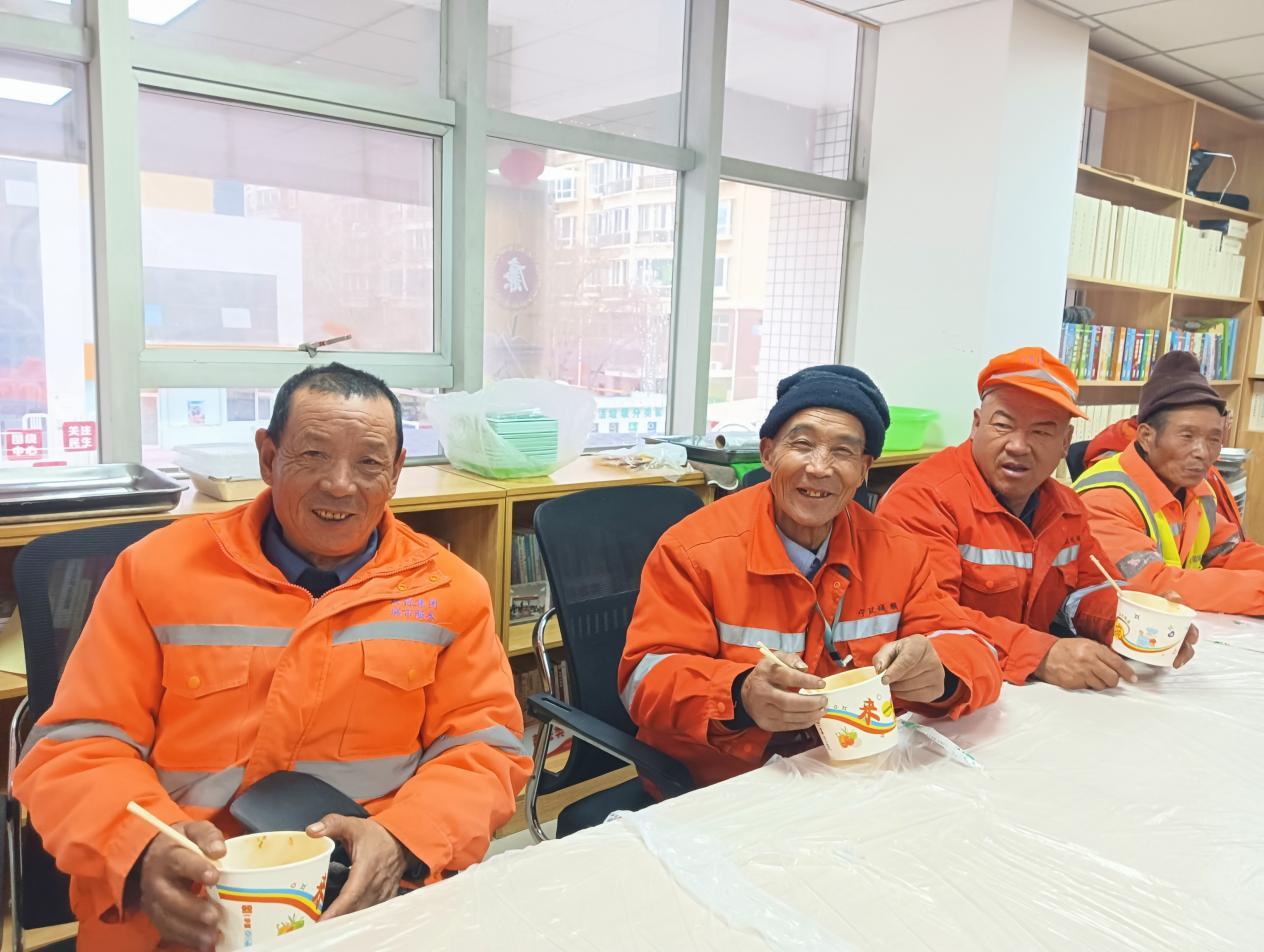 辖区企业职工代表、身着橙色工装的环卫工人陆续到场,大家搓搓手、暖暖身子,笑着互相打招呼。“王师傅,今天街道扫得干净不?”“李姐,你们单位最近忙不忙?”陌生的面孔在寒暄中渐渐熟络。当一碗碗热气腾腾的粉汤饺子端上桌,洁白的饺子浸在鲜香的汤汁里,撒上翠绿的香菜、淋上鲜红的辣椒油,光看着就让人食指大动。大家围坐成一圈,端着碗、拿着筷,吃得热火朝天,额角都冒出了细密的汗珠。