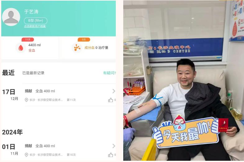 于艺涛老师已成为校园里一面闪亮的旗帜,他连续11次参与献血,累计献血量4400毫升。这不仅仅是一个个数字,更是他用热血铺就的爱心长路。