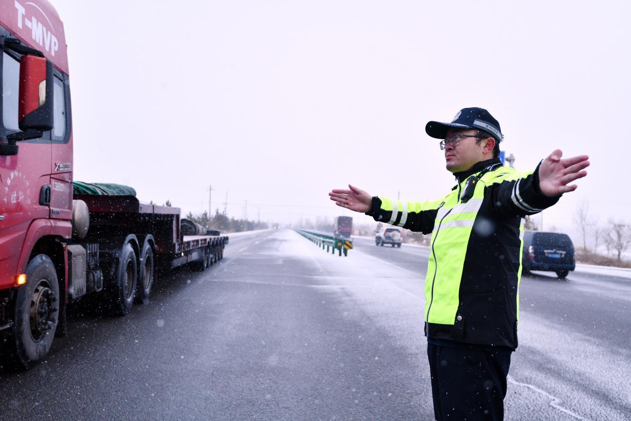 处理完后,王金山、师麟峰继续回到执勤点位,一遍遍打着手势指挥车辆安全顺利通行,雪越下越大,二人身上附着了厚厚的一层积雪,面部冻的通红,睫毛上冻结了冰霜,但二人从没离开执勤点位,实在冻得受不了就在原地搓搓手、跺跺脚。“下雪天对交警也是考验,我们多指挥一辆车通行,交通事故的发生率就会降低一分。”说话时,王金山哈气成霜。