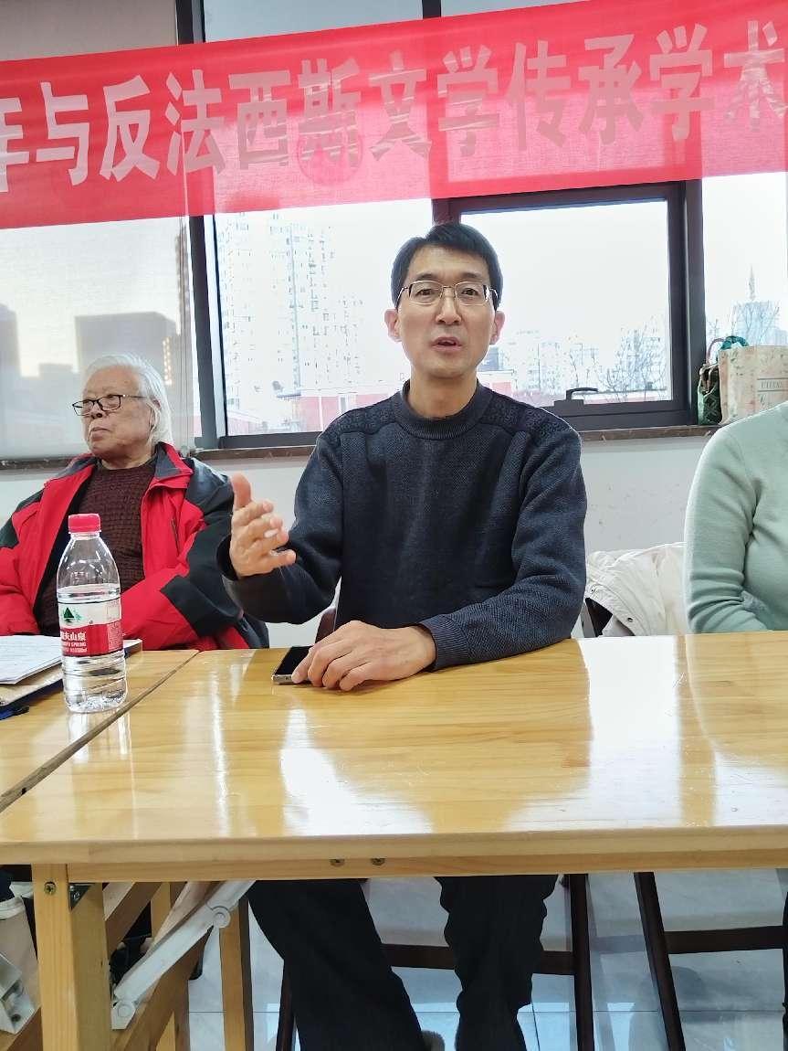 图12说:北京冰封雪飘文化传媒有限公司总顾问、著名诗人作家资深媒体人、中国萧军研究会理事符文军宣读他的论文节选《萧军〈八月的乡村〉与反法西斯文学传承研究》。( 周强 摄)