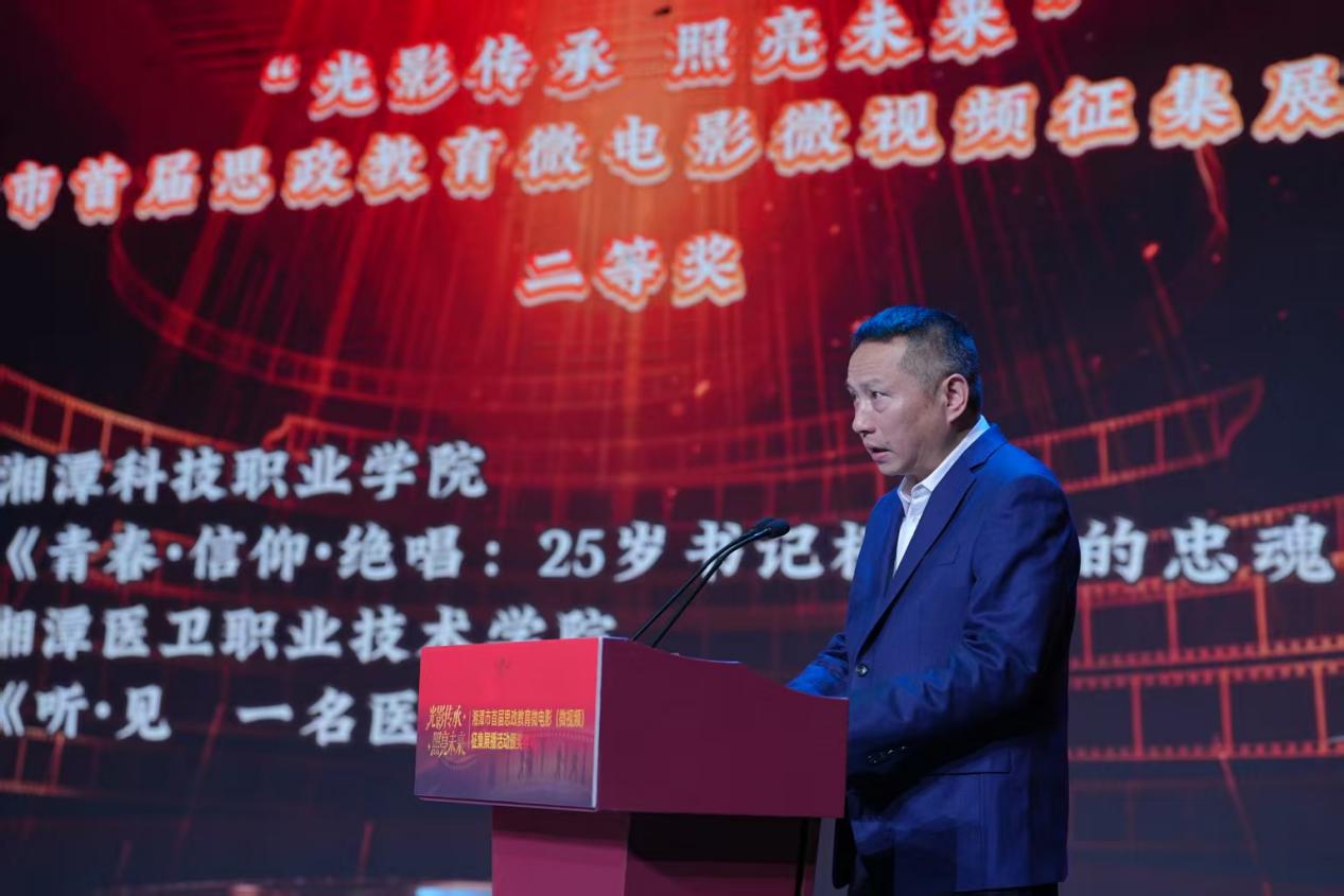 中共湘潭市委常委、宣传部部长胡忠威在开幕式上致辞 颁奖现场庄重而热烈,典礼通过精心设计的“记录时代 浸润心灵”“光影育人 培根铸魂”“光影传承 照亮未来”三大篇章进行。第一篇章颁出了微电影和微视频单元三等奖以及最佳人物角色奖、最佳创意奖、最佳摄影奖、最佳编剧奖。