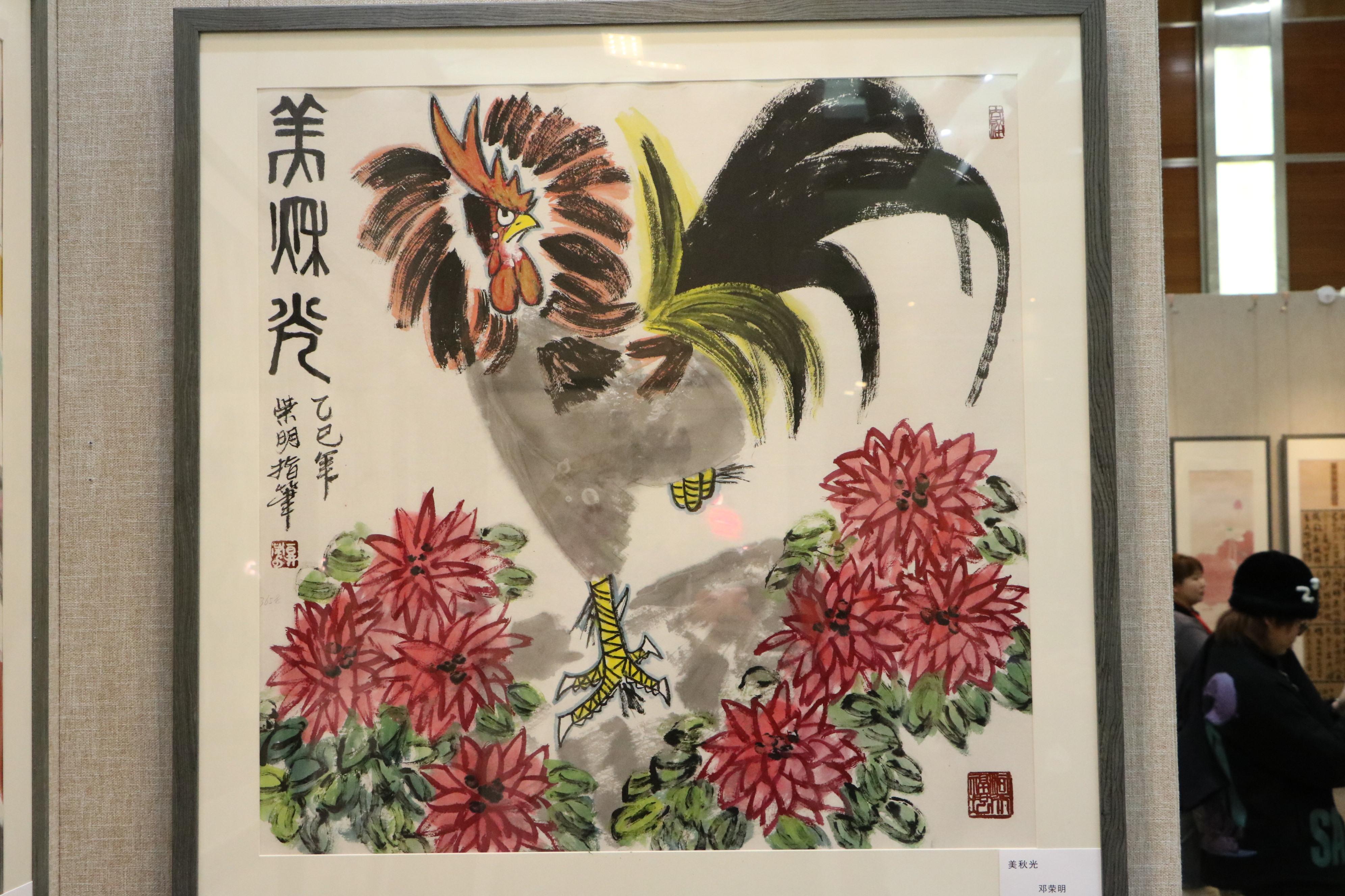 在第六场展览中,淮安著名艺术家邓荣明的指墨画作品《美秋光》尤为引人注目。作品以传统指墨技法为基础,通过公鸡与秋菊的意象组合,既呈现秋日景致,又寓意吉祥高洁。画作在传承陈大羽先生笔墨精神的同时,巧妙融入西方色彩对比手法,为非遗技艺注入了当代审美表达,展现出传统艺术在创新中焕发的蓬勃生机。