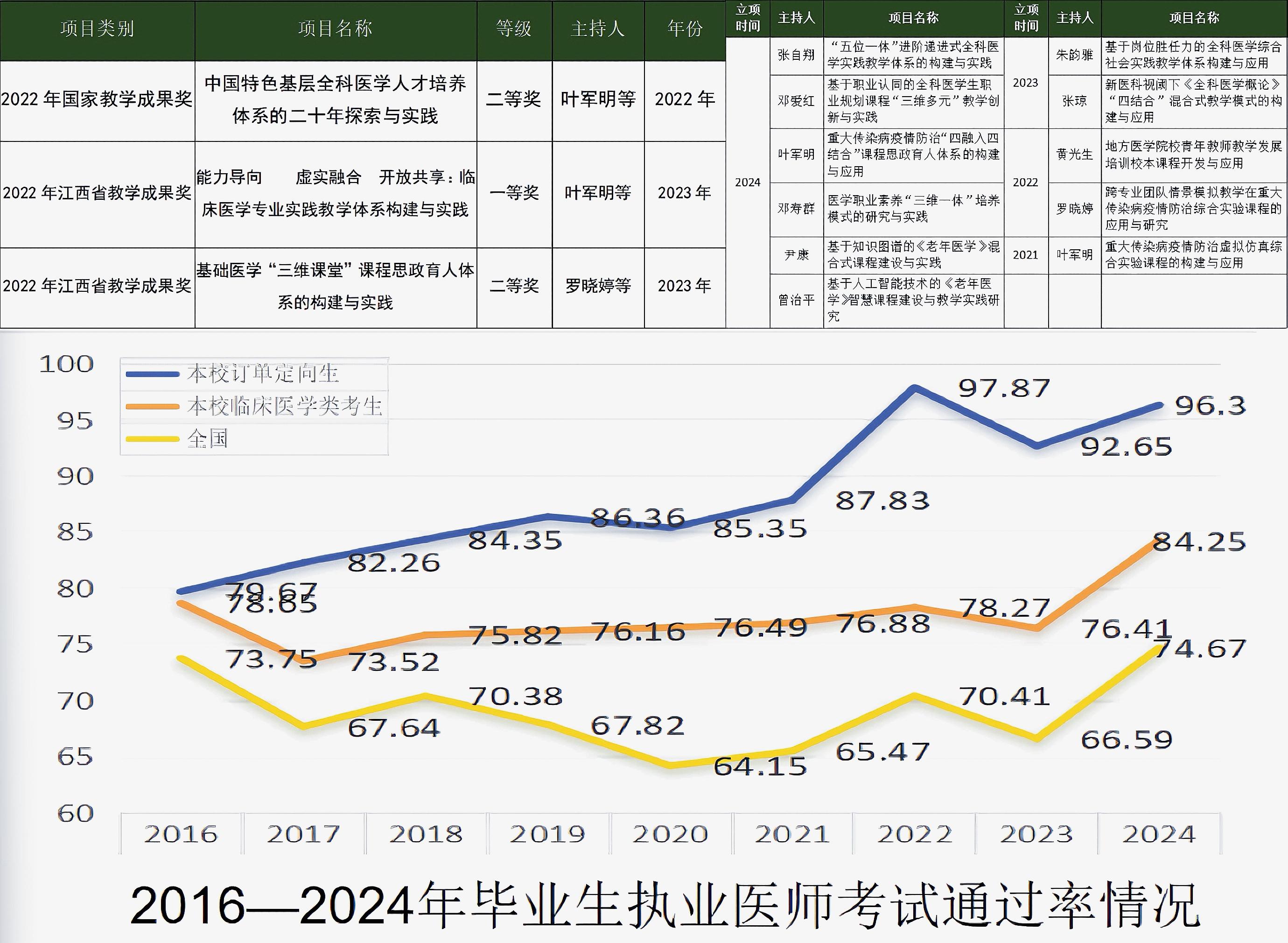 秉持“围绕中心抓党建,抓好党建促业务”理念,学院以党建引领教学科研与人才队伍建设双向发力。深化教师骨干队伍建设,强化人才引进力度,率先探索全科医学“3+2”人才培养新模式,推行“五年不间断”实践教学体系,将临床实践与理论教学紧密结合。凭借科学的培养体系,2022届、2023届、2024届毕业生执业医师总通过率分别达到97.87%、92.65%、96.30%,远高于全国同类高校平均水平,彰显了人才培养的硬核实力。教学科研成果丰硕,全科医学教学团队获评江西省高水平本科教学团队,《中国特色基层全科医学人才培养体系的二十年探索与实践》荣获国家教学成果奖二等奖,斩获省级教学奖励4项、校级教学奖励3项,《重大传染病疫情防治》成功入选国家级一流本科课程,形成了党建引领下教学科研协同发展的良好态势。