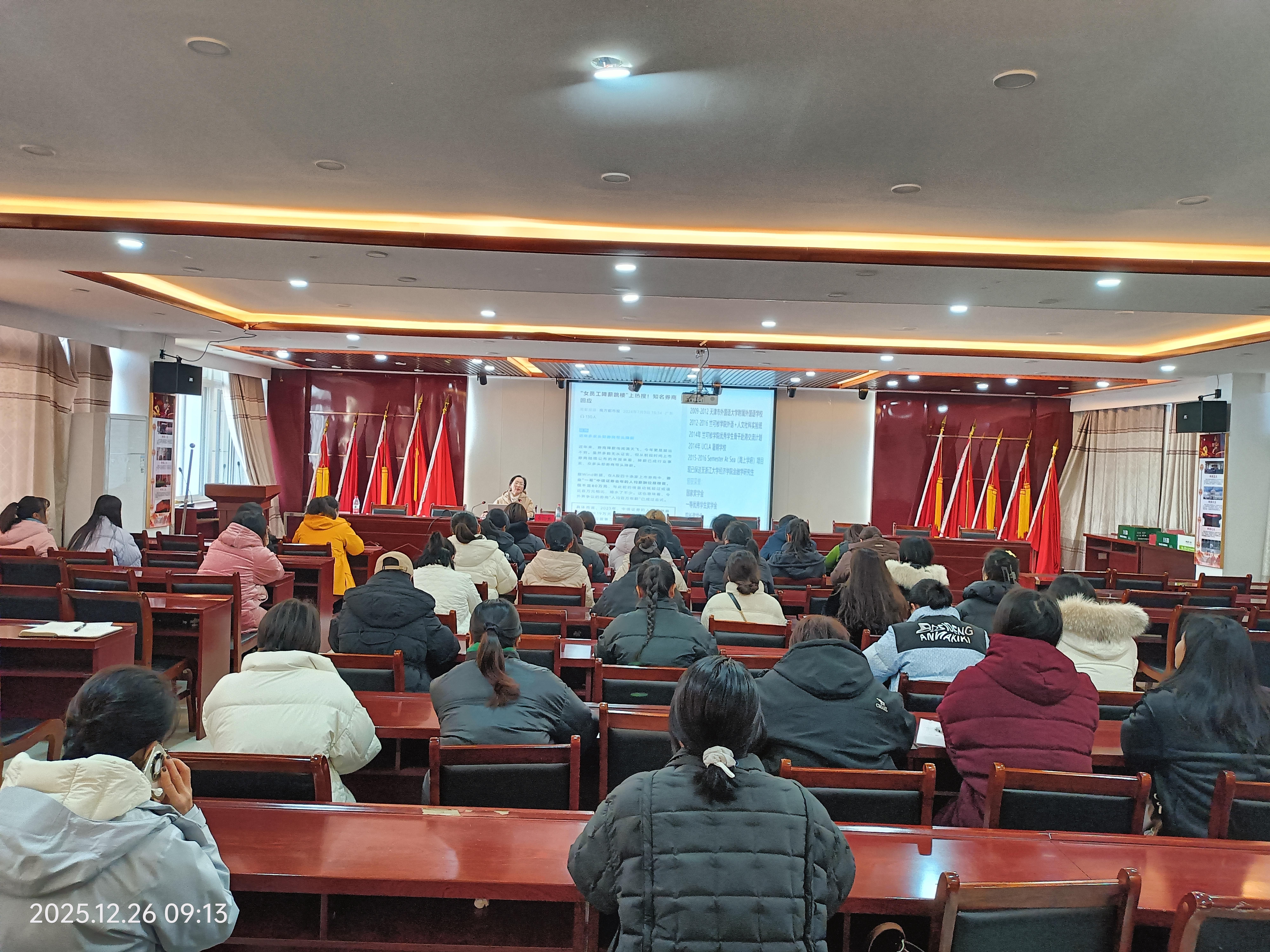 为深入学习贯彻党的二十届四中全会精神,切实把思想和行动统一到全会决策部署上来,凝聚青年力量、彰显巾帼担当,12月26日上午,金明池街道团工委、妇联联合示范区妇联、团区委开展党的二十届四中全会精神青年专题宣讲活动。市委党校社会学教研室主任、市妇联挂职副主席、市政协委员崔迎新老师应邀作专题宣讲,金明池街道八级职员石海燕,各社区妇联主席、团支部书记,以及金建烟草公司、新奥燃气有限公司、民建官瓷、中州国际饭店及强力有限公司等新兴领域团组织、妇联组织代表参会学习。