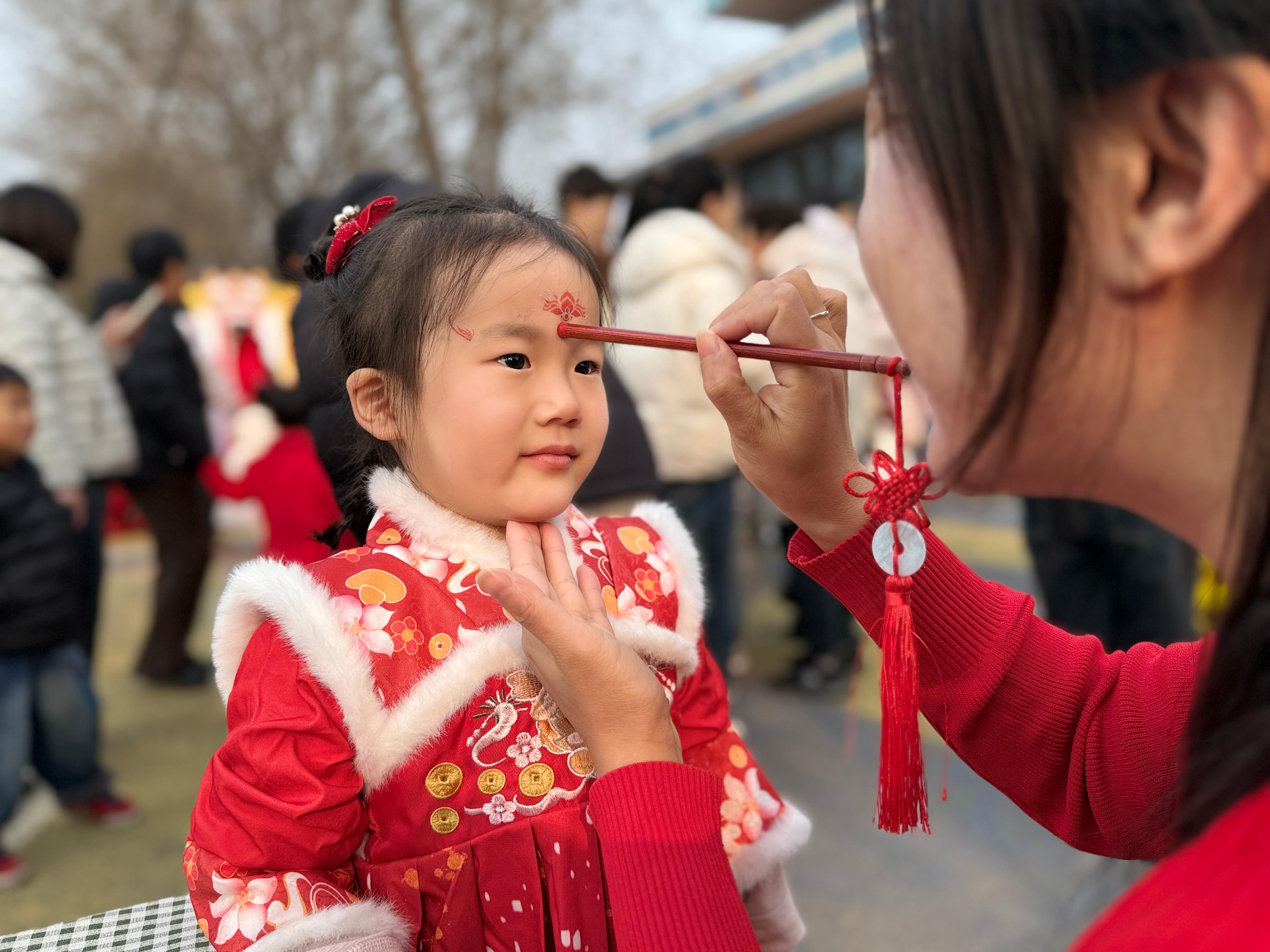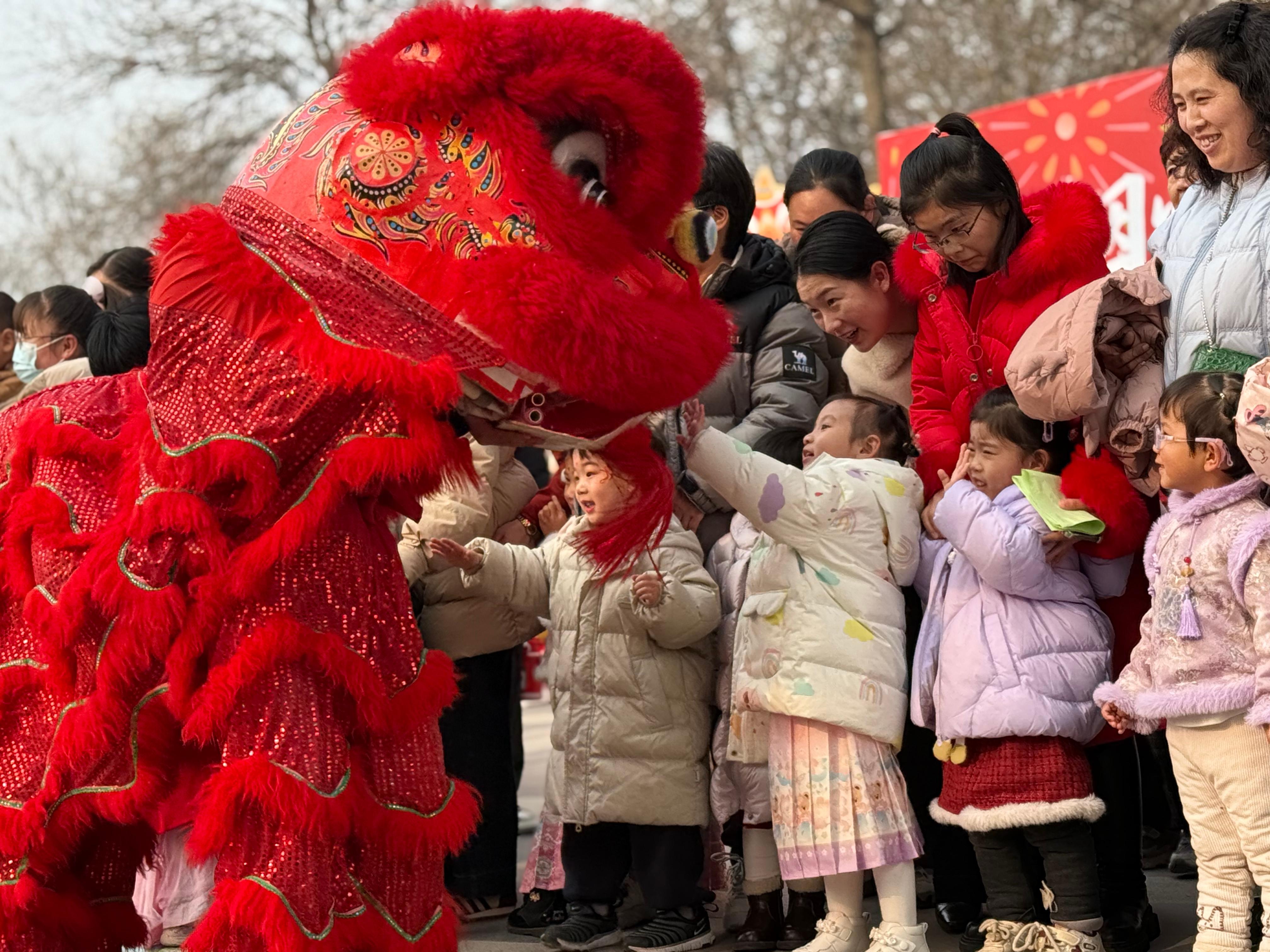 活动伊始,朱砂启智、写福贴福仪式有序开展,喜庆发箍让萌娃们神采飞扬。随后,舞狮腾跃、南鱼龙灯蜿蜒舞动,隆尧县豫剧爱好团同步登场,经典豫剧选段婉转悠扬,为庙会增添了浓郁醇香的年味,非遗瑰宝的独特魅力扑面而来,在孩子们心中悄然播下文化自信的种子。
