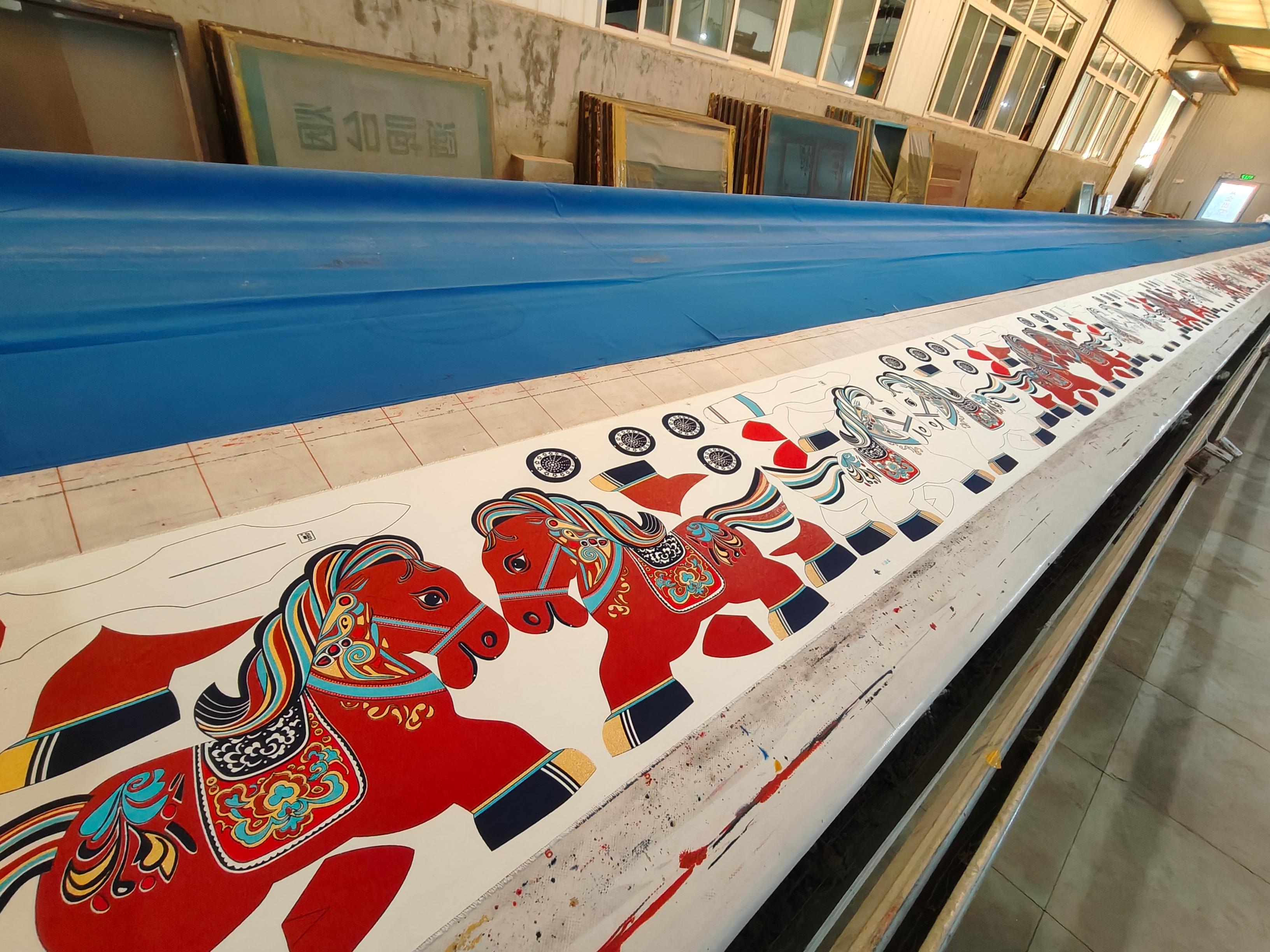 在工艺设计上,作品践行“传统为根、现代为魂”的创作理念,坚守手工丝网印花的非遗精髓,通过丝网制版、油墨刮印等传统工序,将唐代宝相花、卷草纹、缠枝莲等经典纹样精准复刻于布艺之上,清晰灵动,色彩饱满,兼具历史厚重感与艺术美感,让千年纹样焕发当代活力。造型设计兼顾雄浑神韵与亲和质感,圆润流畅的线条搭配柔软布艺材质,既保留唐马的雍容气度,又呈现出憨态可掬的视觉效果,适配节庆陈设、文化传播、礼赠往来等多元场景。