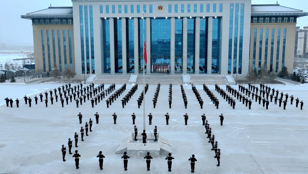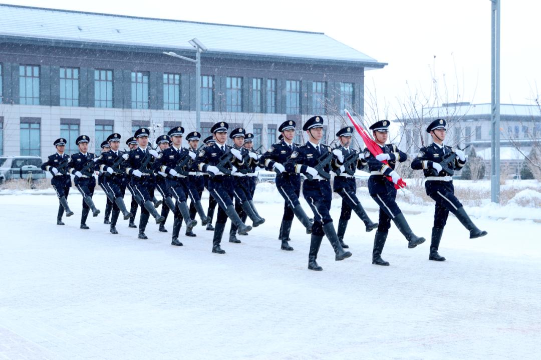 上午9时,迎着瑞雪,全体民辅警警容严整、精神抖擞,在升旗台前整齐列队。伴随着激昂的旋律,国旗护卫队迈着铿锵有力的步伐,护卫五星红旗正步走向升旗台。在雄壮的《义勇军进行曲》中,鲜艳的五星红旗冉冉升起,迎风飘扬。全体人员神情庄重,面向国旗肃立敬礼,高唱国歌,表达对伟大祖国的崇高敬意和美好祝福。