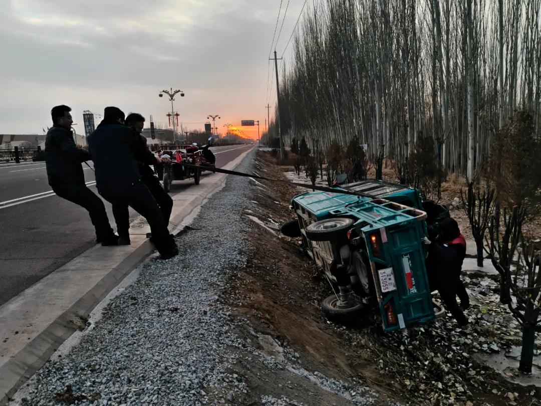 近日,酒泉敦煌市公安局莫高派出所民警巡逻至阳关东路一处绿化带附近时,发现一辆电动三轮车侧翻在地,一名村民被困于变形的驾驶室内无法动弹。由于车门严重扭曲变形,常规方式难以打开且易造成二次伤害,民警迅速联系附近村干部请求支援。村干部携带工具赶到后,警民协作,经过二十余分钟的紧张施救,成功将村民安全救出。确认其身体无碍后,民警又与村干部一同将三轮车转移至安全区域,并提醒驾驶人雪天路滑,驾驶车辆务必控制车速,谨慎慢行。