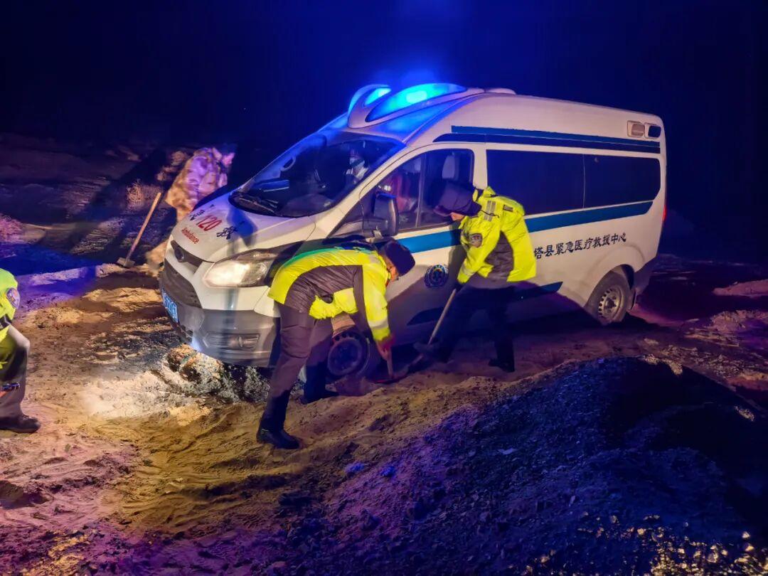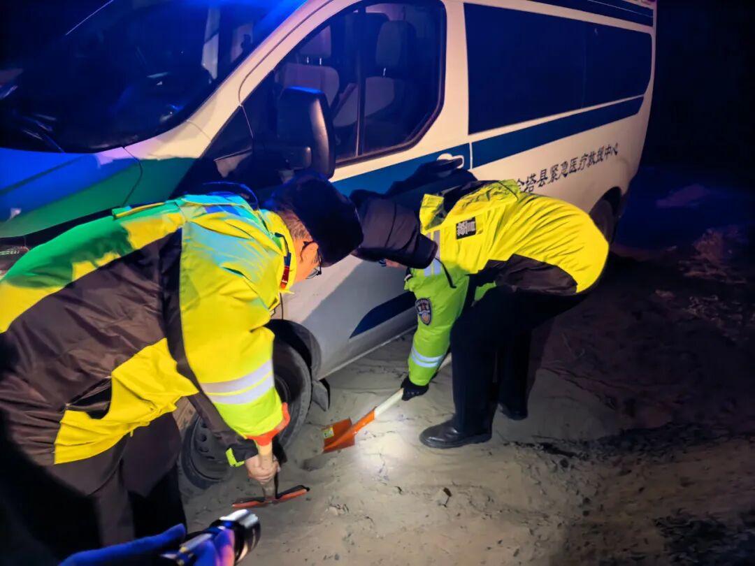 现场,救护车前后轮深陷沙坑,车身明显倾斜,四周旷野无人,医护人员在严寒中瑟瑟发抖。民辅警立即展开行动:有人挥锹清除车轮下的沙石,有人合力推车,有人熟练固定牵引绳……寒风如刀,刮红了他们的脸庞,冻僵了他们的双手,但无人退缩。经过近一小时的奋力施救,随着发动机重新响起轰鸣,救护车终于脱离险境。