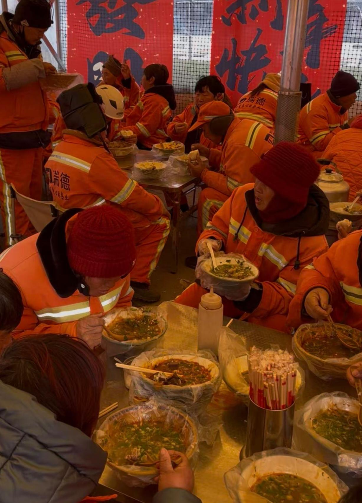仅在床上休息了几个小时,清晨八点,三人又回到了店里。为让环卫工人能在温暖的环境中用餐,他们搭起了大棚。