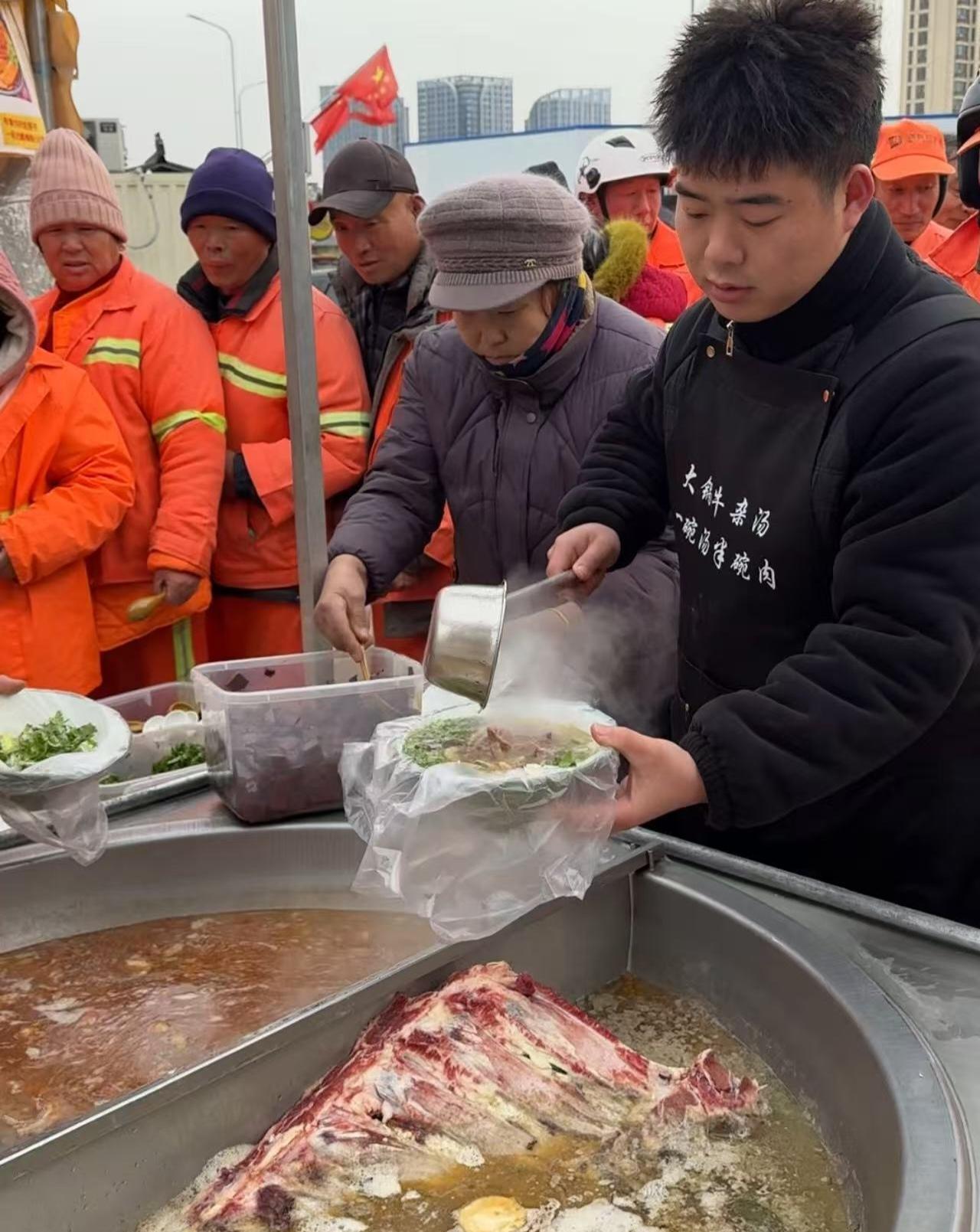 “我干了十多年环卫,还是第一次有饭店专门请我们吃饭。”一位年长的环卫工人说,“这汤真暖和,从嘴里暖到心里。”