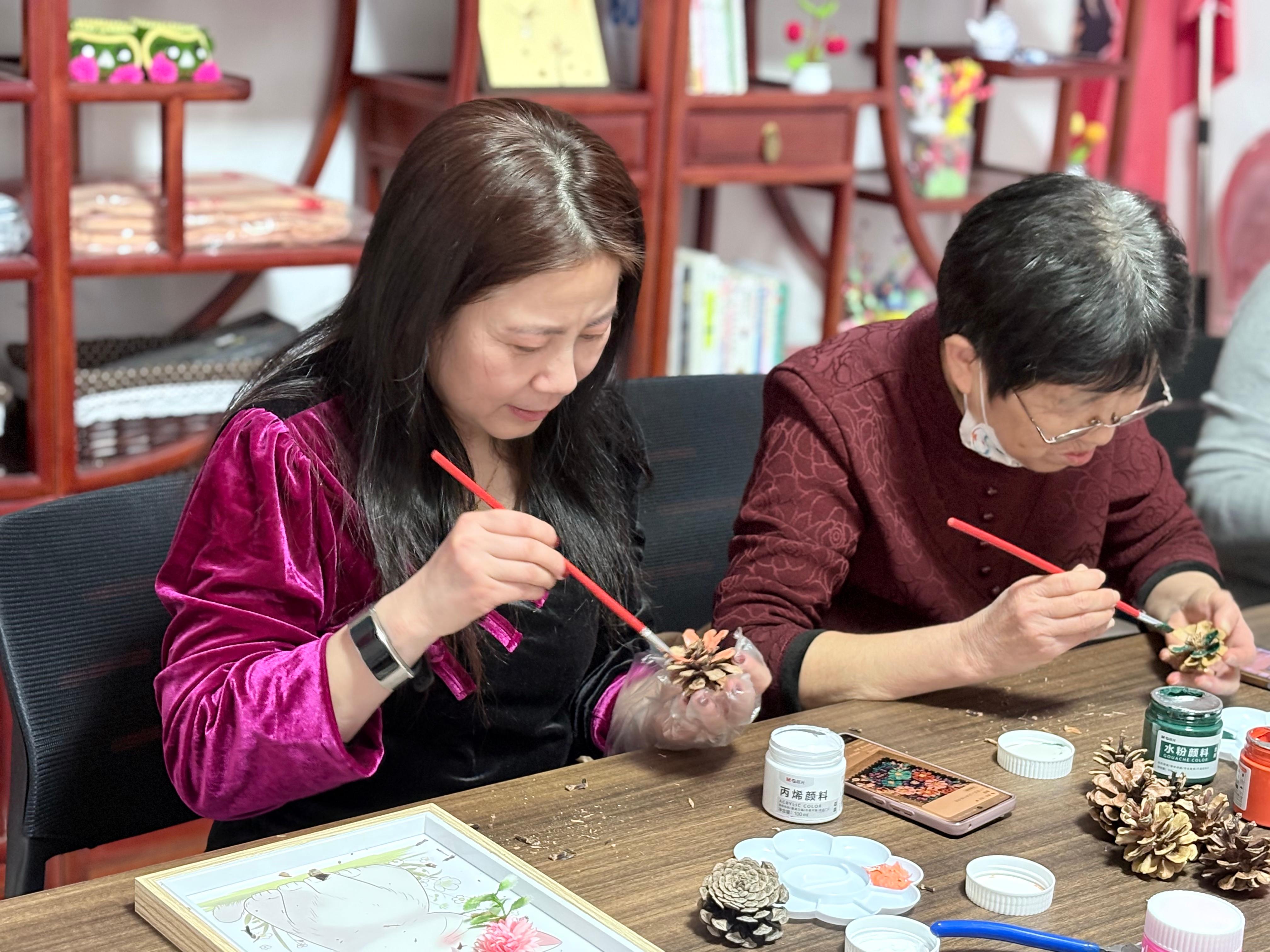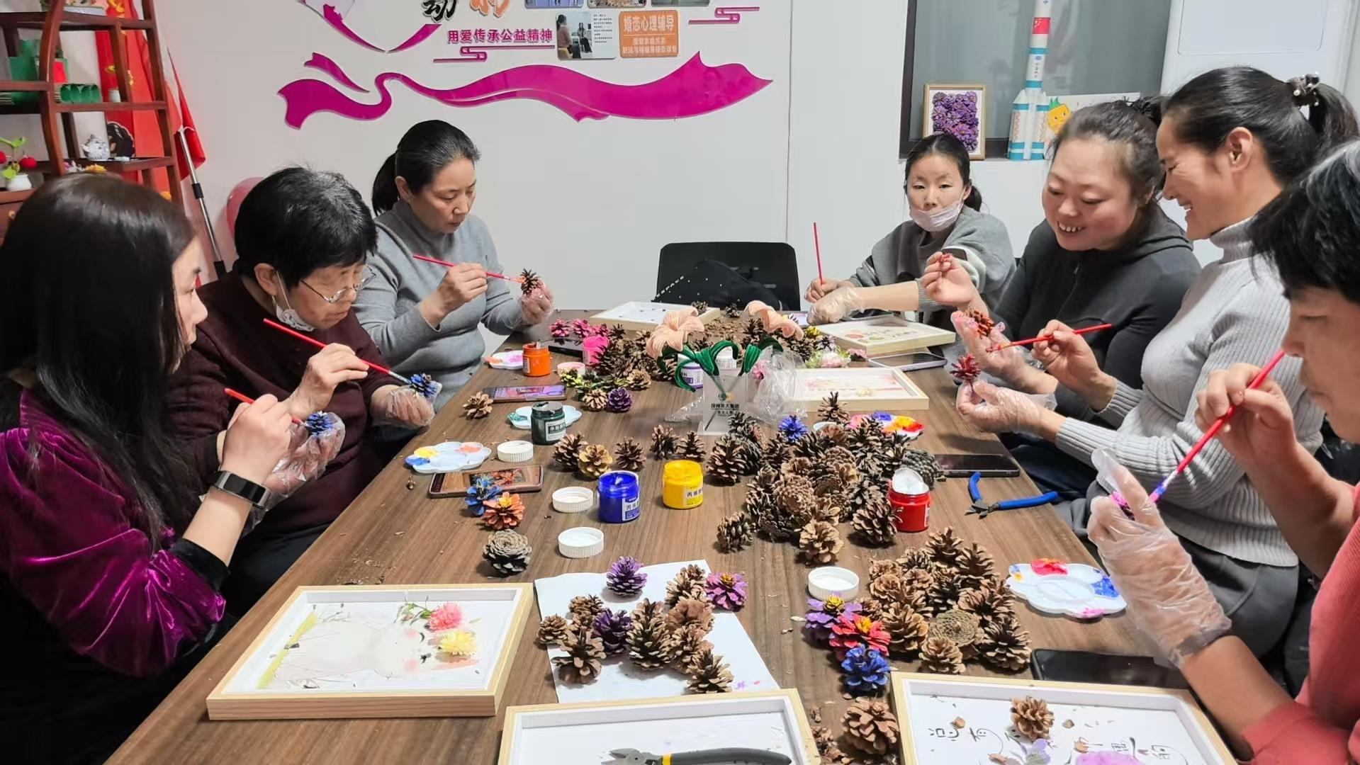 1月8日,隆尧县柏人社区“心随手动”手工活动第十期在社区手工活动室举办,辖区内报名参加的女同志围坐在一起,用松果与颜料开启创意之旅。