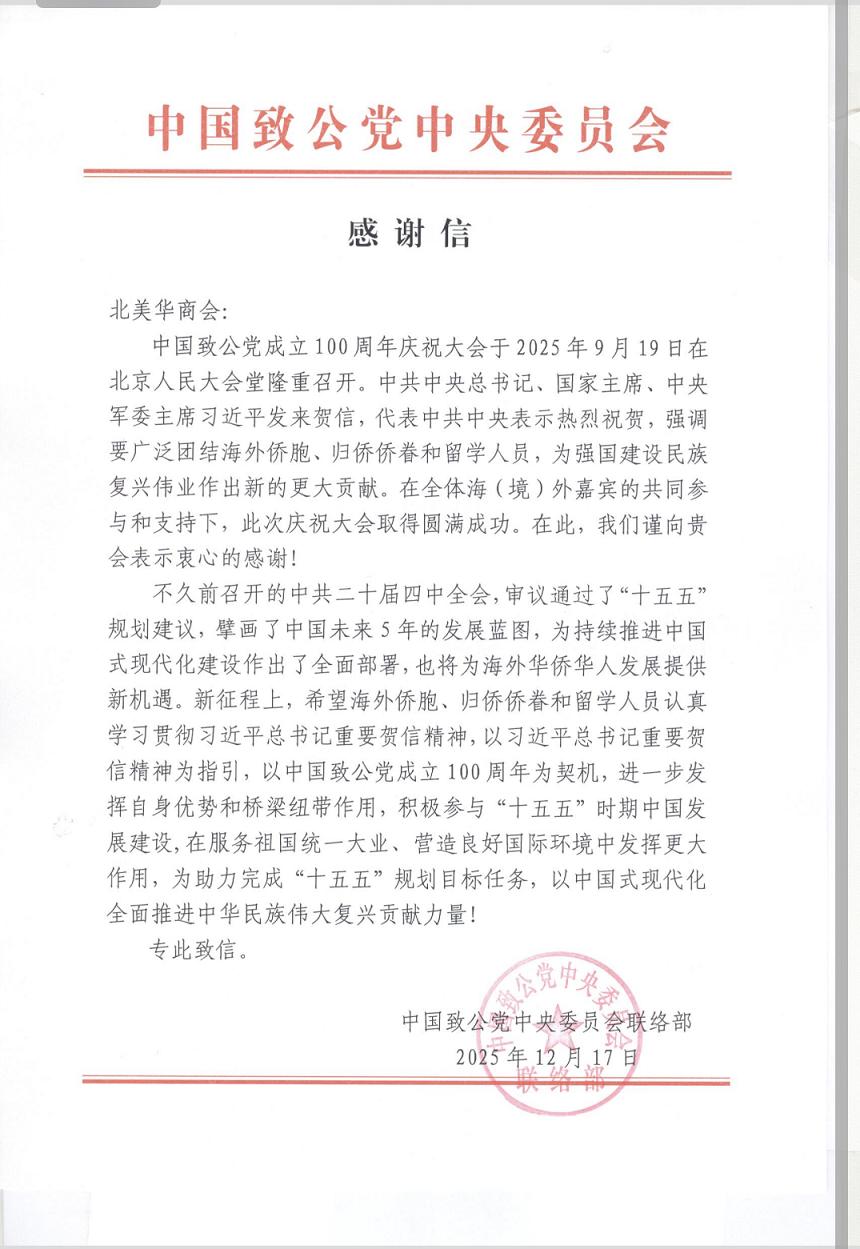 2025年9月19日,中国致公党成立100周年庆祝大会在北京人民大会堂隆重召开,中共中央总书记、国家主席、中央军委主席习近平发来贺信,代表中共中央表示热烈祝贺,强调要广泛团结海外侨胞、归侨侨眷和留学人员,为强国建设民族复兴事业作出新的更大贡献。在全体海(境)外嘉宾的共同参与和支持下,此次庆祝大会取得圆满成功,我会也因参与其中获得中国致公党中央委员会联络部于2025年12月17日致送的感谢信。信中结合中共二十届四中全会审议通过的“十五五”规划建议,寄望海外侨胞以习近平总书记重要贺信精神为指引,以中国致公党成立100周年为契机,进一步发挥自身优势和桥梁纽带作用,积极参与“十五五”时期中国发展建设。