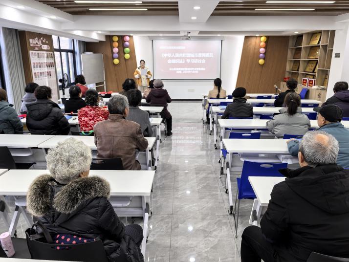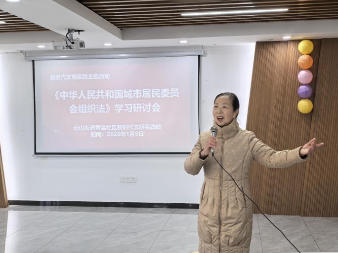 活动伊始,黄湓社区工作人员章佳怡走上讲台。“各位叔叔阿姨,今天我们不枯燥地念条文,”她微笑着开场,“我们一起来聊聊《中华人民共和国城市居民委员会组织法》,这部与咱们每家每户都息息相关的法律。”章佳怡紧扣社区生活实际,将《居委会组织法》中的条文转化为一个个生动的社区故事,并对法律中关于居委会职责的内容作了重点解读。