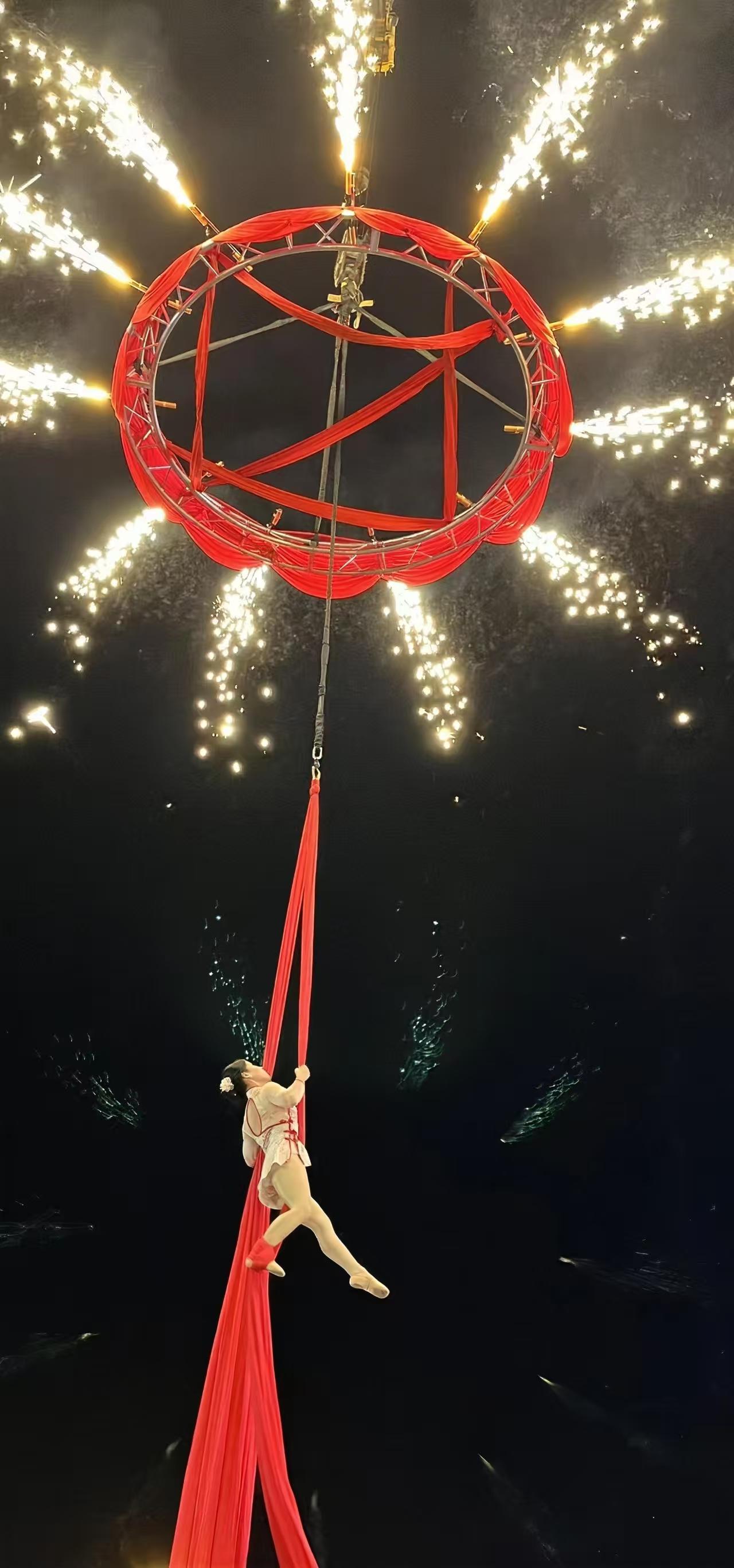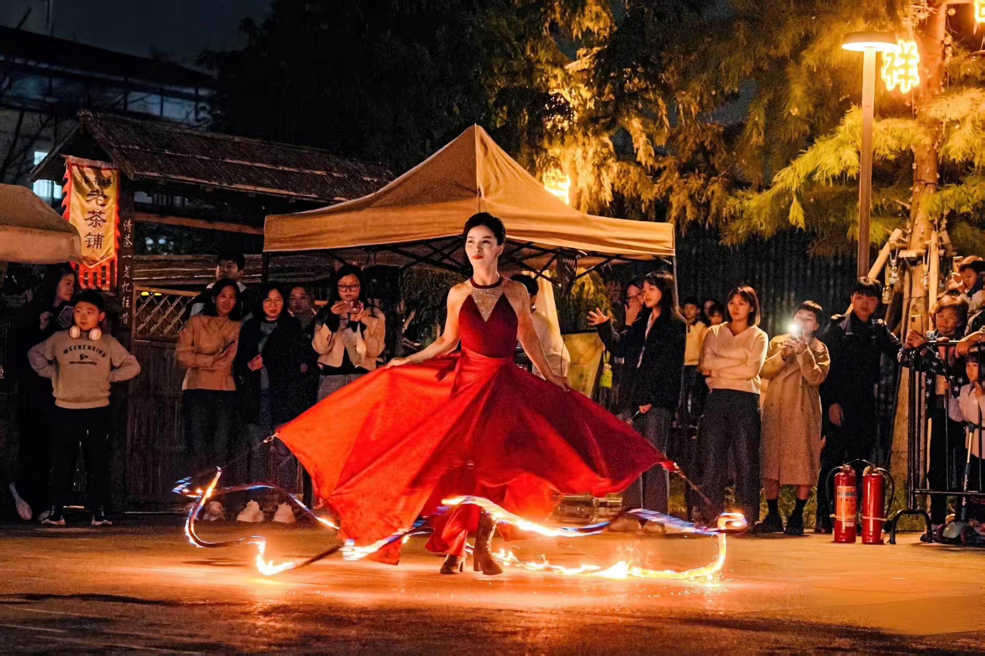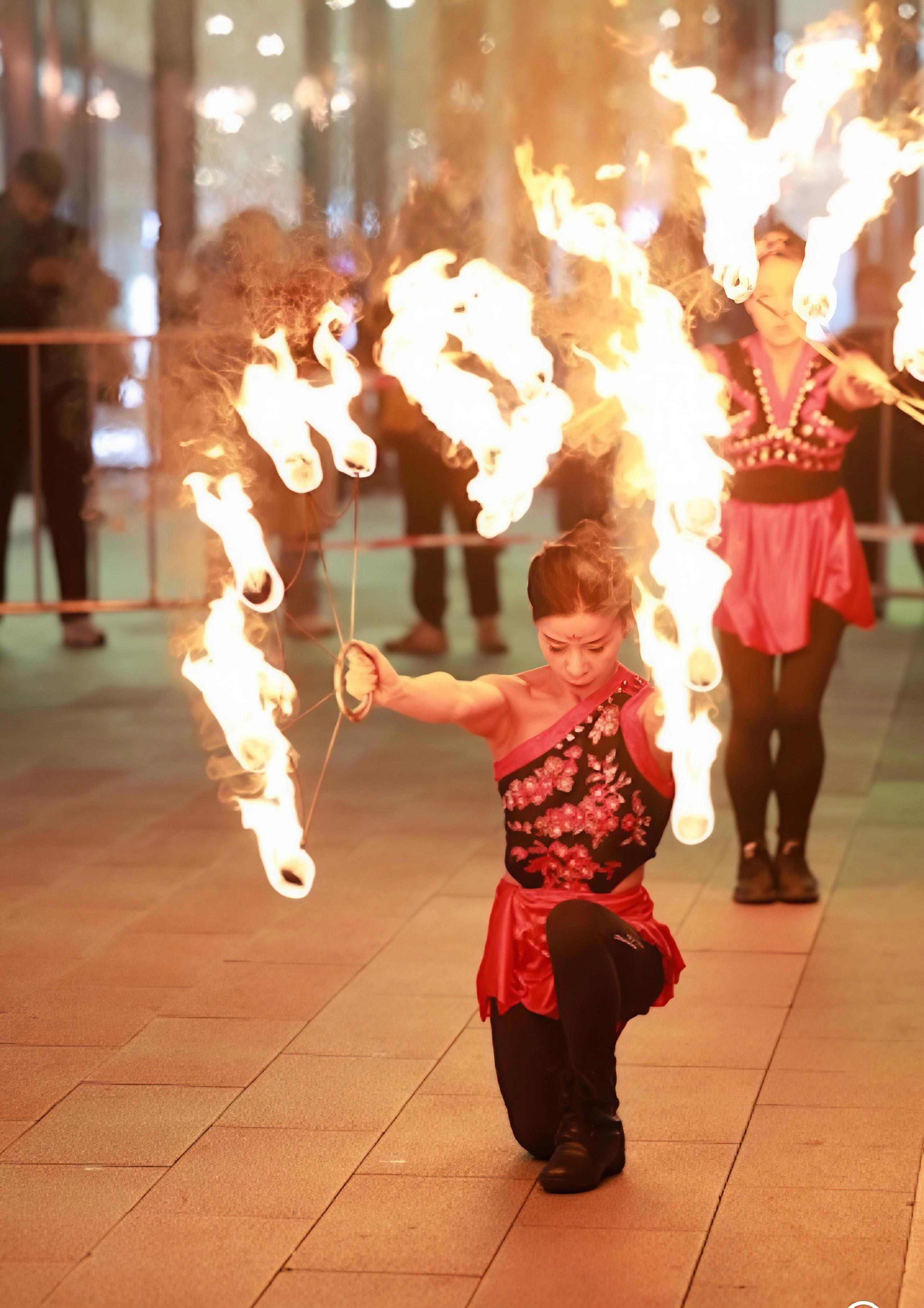 庄春丽带着自身的绝技,火裙舞,双人绸吊,吊环,喷火等技艺迎接四方宾客,为游客们带来视觉效果与欢快的笑容。