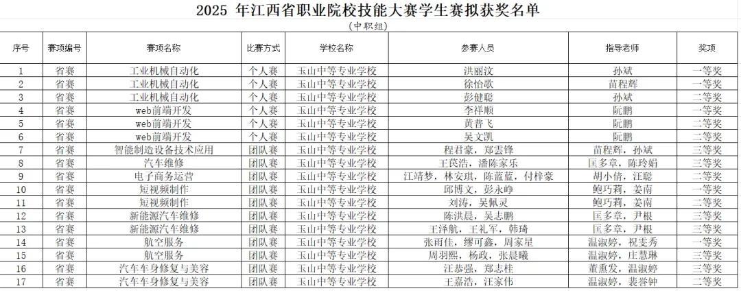 近日,2025年江西省职业院校技能大赛圆满落幕。江西省玉山中等专业学校学子在比赛中锐意进取、奋勇拼搏,凭借扎实的专业技能和出色的临场发挥,在多个赛项中斩获殊荣,共荣获一等奖5项、二等奖6项、三等奖6项,总计17个奖项的优异成绩,全面展示了我校学生精湛的技能水平和学校丰硕的教育教学成果。