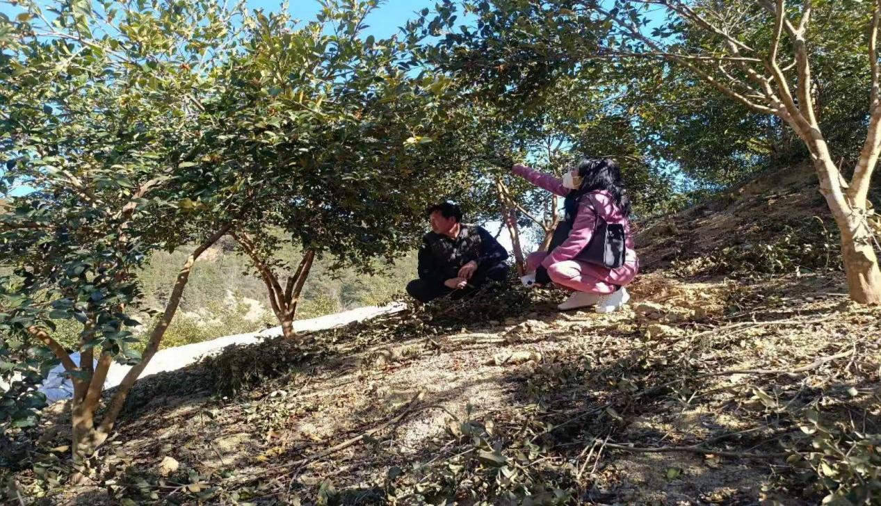 “一开始我们还不信,觉得专家讲的书本知识不接地气。”村民李春回忆道。为打破隔阂,团队把课堂搬到油茶林,油茶专家宋祥兰教授现场演示嫁接手法,强调“刀要快,切口要平,形成层对齐”;队员手把手教村民涂白、修剪病枝,并编印《油茶管护口袋手册》,将“土壤pH值”“生物农药稀释比例”等术语转化为“看叶片颜色辨缺肥”“按1桶水加2瓶盖药”的土方法,方便村民掌握。2022年秋冬,团队每月驻村指导,风雨无阻,逐渐赢得村民信任。李春主动将5亩老树全部嫁接新品种,并通过微信群实时咨询。