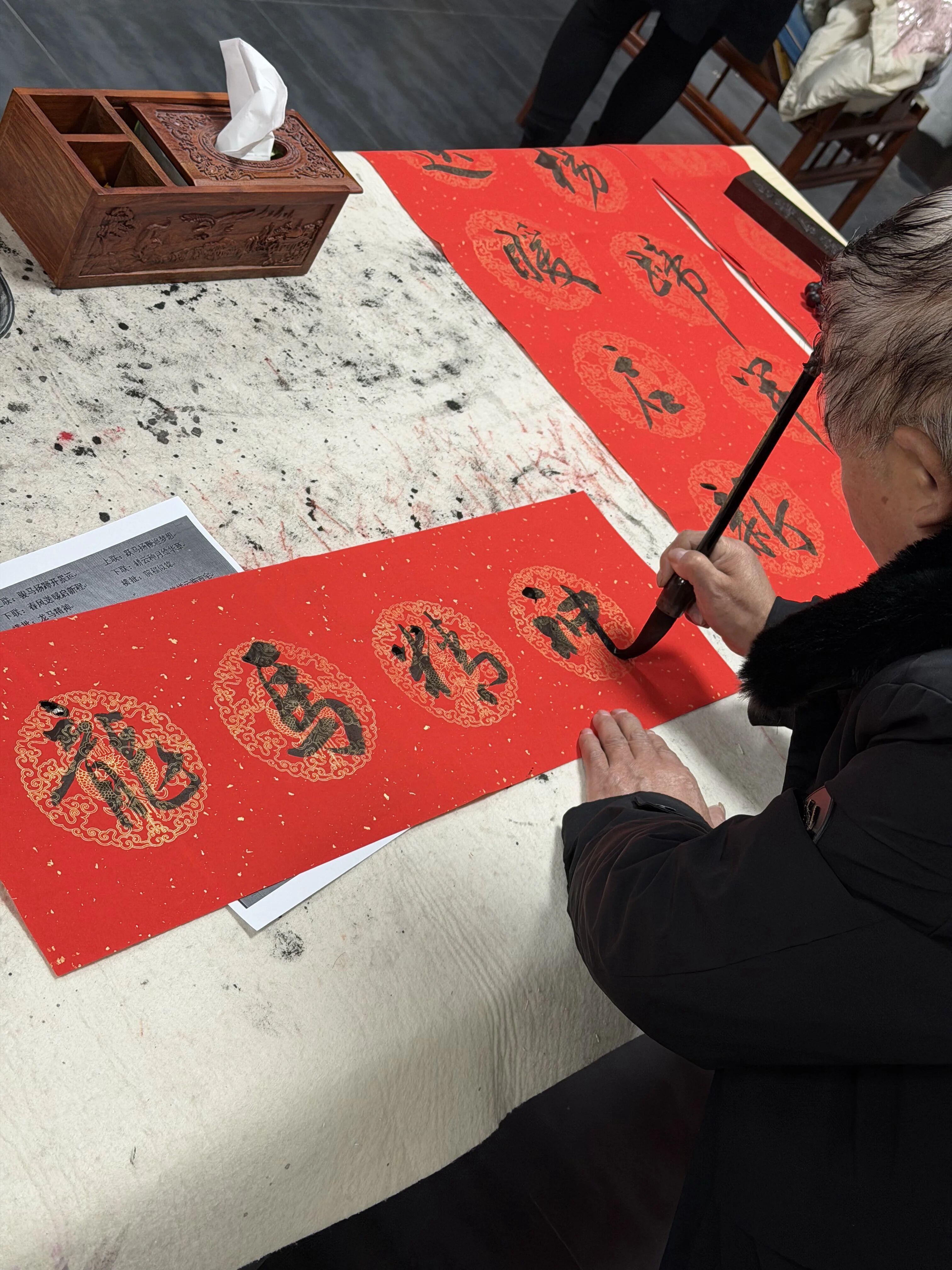 雅集伊始,红纸铺案,墨韵流转。范松平先生执管挥毫,笔走龙蛇,毫端似有烟霞生。一方方雍容浑厚的“福”字,一幅幅寄意祥瑞的楹联,自其腕底涓涓而出。其用笔,融汇多年钻研之心得与传统文化之熏陶,方寸之间,气象万千。范先生感言:“书法乃中华文脉之精魄,一点一划,承载着千古文心。值此新春,愿以翰墨传递祝福,守护与弘扬这份珍贵的文化遗产。” 陶勇理事长与范先生并立案前,就书法艺道之传续与发展相与深谈。陶勇理事长指出:“东方收藏艺术馆始终致力于弘扬中华优秀传统文化。范先生折桂‘兰亭杯’,其艺术成就是对传统最好的继承与创新。本次雅集,正是让高格艺术融入时节生活的生动实践。未来,我馆将继续筑桥引路,联结艺术家与公众,共促艺脉长青。”