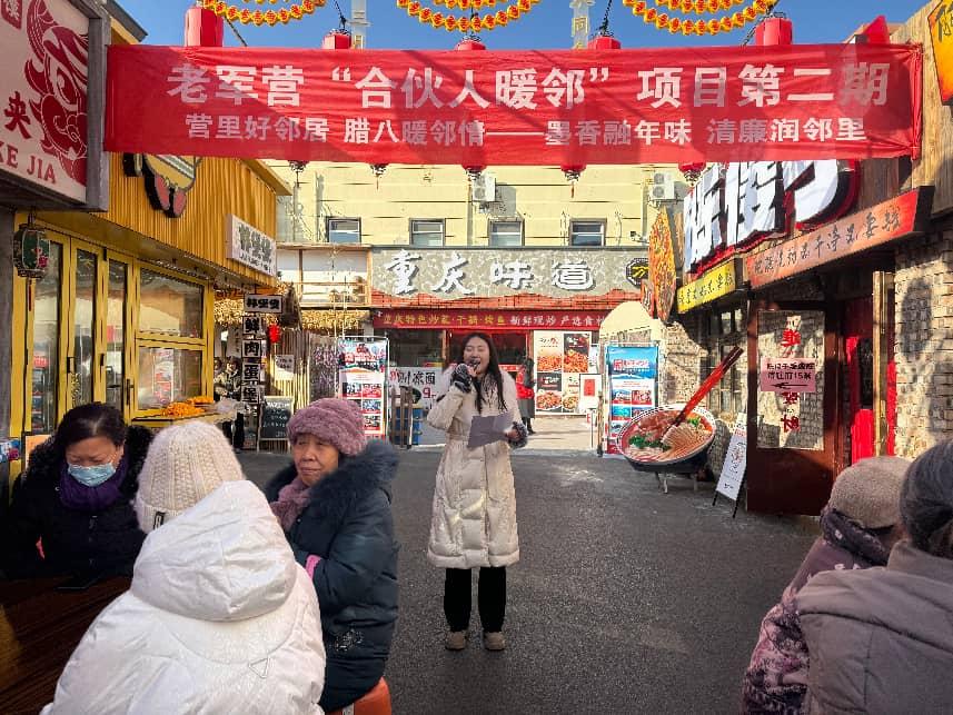 社区文化网讯(李锐娜 报道 通讯员 赵冬梅)腊八至,年味浓,邻里情谊暖寒冬。2026年1月22日上午,老军营街道老军营小区第二社区“合伙人暖邻”项目第二期活动在吉祥里温情上演。一场以“营里好邻居 腊八暖邻情——墨香融年味 清廉润邻里”为主题的社区暖心行动,为百余位社区志愿者、邻里互助典型、楼栋长、好邻居等群体送上真挚问候与冬日暖意,也将“合伙共建 志愿同行”的社区治理新模式,浸润到每个参与者的心间。