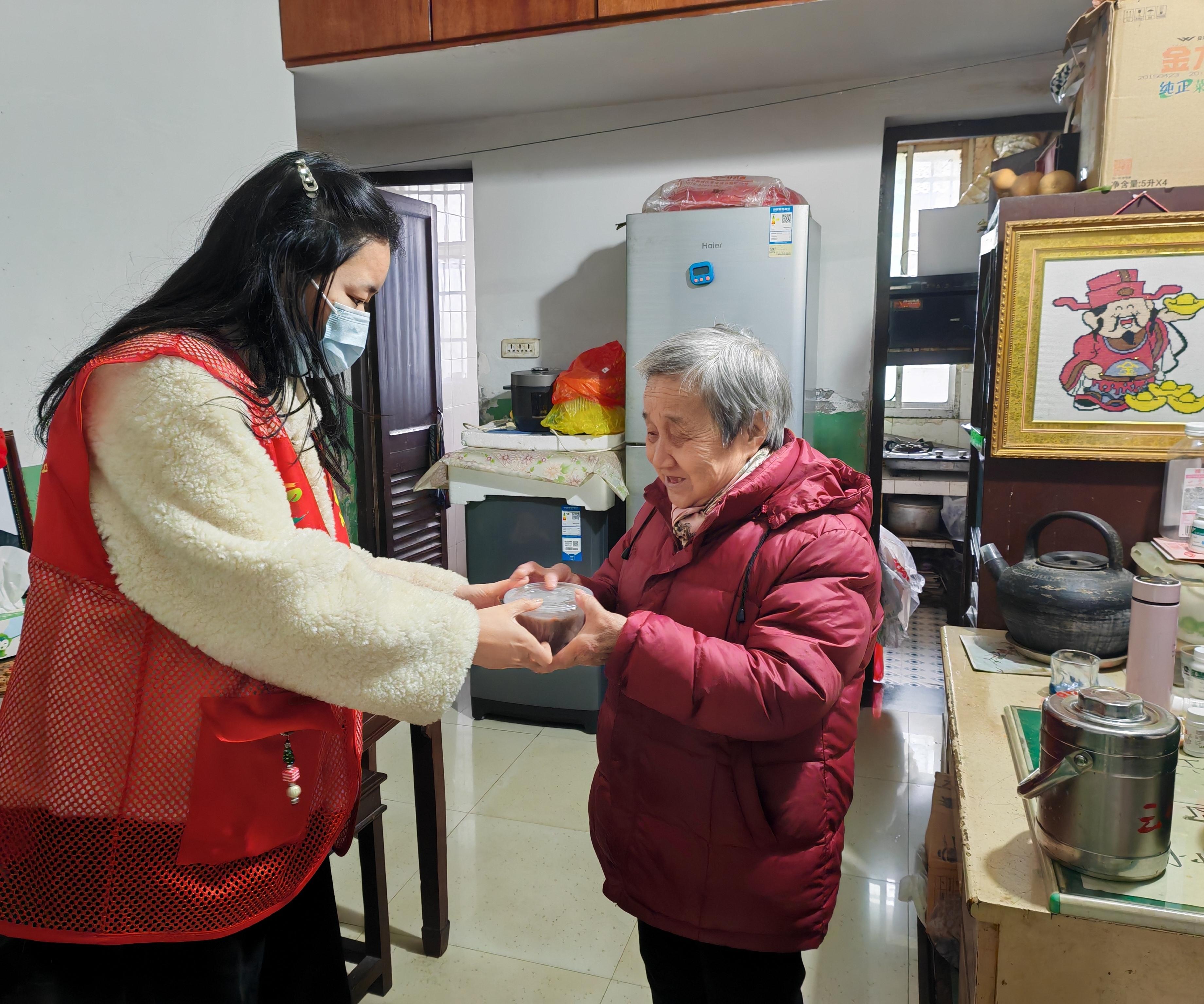 与此同时,由社区工作人员和志愿者组成的“暖心送粥队”已分头出发,带着刚盛好的粥上门走访辖区独居老人。每到一户,志愿者都轻叩门扉、报清来意,将温热的腊八粥递上。“每年腊八,粥还没喝上,心先暖了。”88岁的吴奶奶捧着粥碗,眼眶微润,碗中粥色清亮,米粒软糯,红枣沉底,枸杞浮面——那是被细心挑去核、剪成小块的温柔。