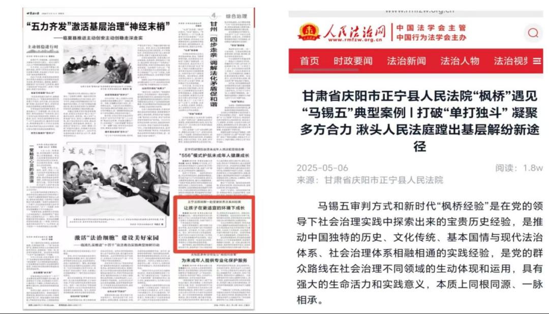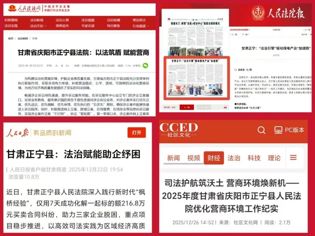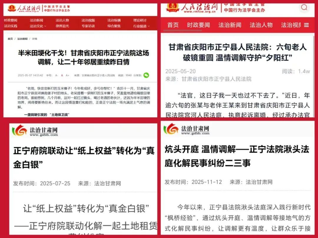 市级媒体:《庆阳审判》、庆阳市人民政府网、庆阳政法网、庆阳中院等刊发50余篇,常态化报道便民举措与基层实践。