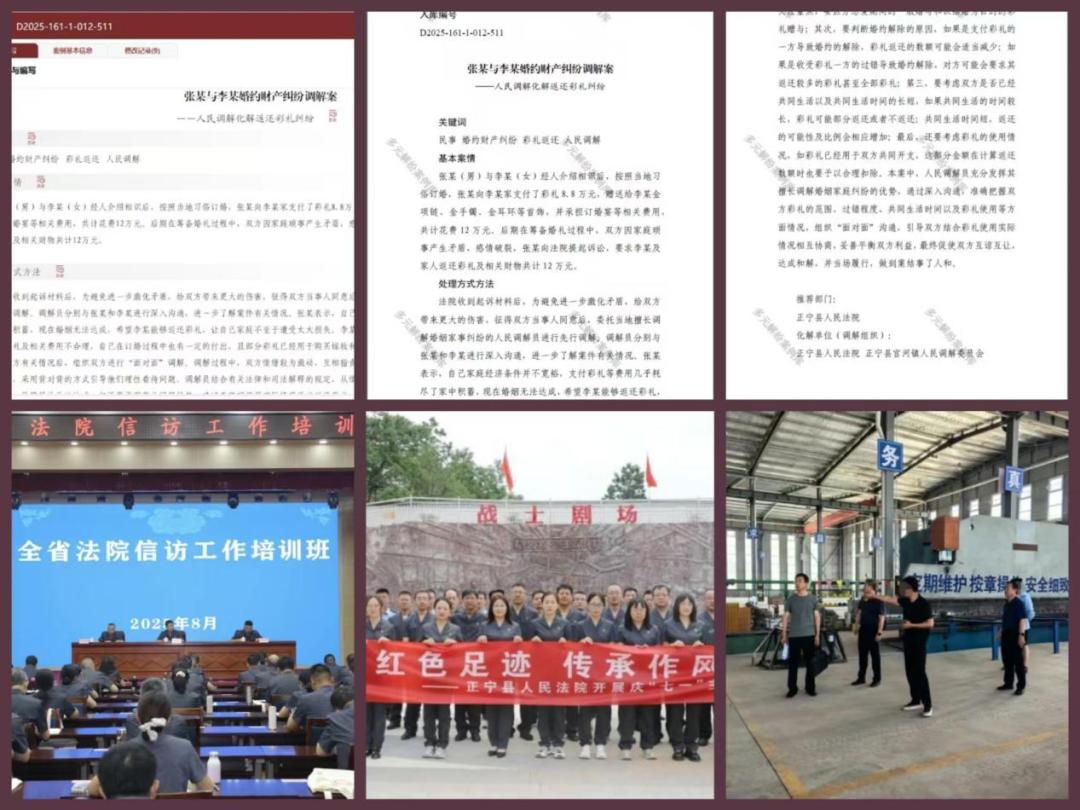 人民法治网先后刊发审判执行、党风廉政建设和反腐败工作会议、司法审判数据分析研判、庆“七一”主题党日等系列报道,全面展现正宁法院从严治院、提质增效成效;《陇原法苑》和甘肃法官学院网刊发干警培训感悟,彰显队伍专业素养;3人荣获全省法院“优秀裁判文书奖”、正宁法院在全省信访工作培训班作经验交流发言,为基层法院信访工作提供实践参考;《张某与李某婚约财产纠纷调解案》入选最高人民法院多元解纷案例库;执行局高效执行案例获媒体广泛报道,生动诠释司法权威与温度。