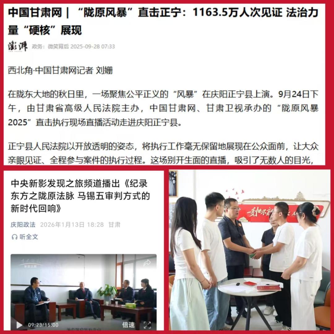 推进新媒体阵地建设,2025年开通官方视频号,推出《周家法庭“调立审执访”汇就司法为民新“枫”景》《屋檐下的天平》、执行攻坚视频等微作品。庆阳电视台《法治庆阳》栏目对“冬日攻坚”行动作深度报道。“陇原风暴”执行直播直击现场,正宁站观看量达1163.5万人次,引发强烈持久反响,被中国甘肃网以《“陇原风暴”直击正宁:1163.5万人次见证 法治力量“硬核”展现》为专题进行深度报道,直观呈现执行和解、强制腾退、现场扣押、司法拘留、以羊抵债等执行场景,让司法权威可感可触;中央电视台在《纪录东方之陇原法脉 马锡五审判方式的新时代回响》专题片中,播报了县法院煤电法庭、果园法庭和民族普法工作。
