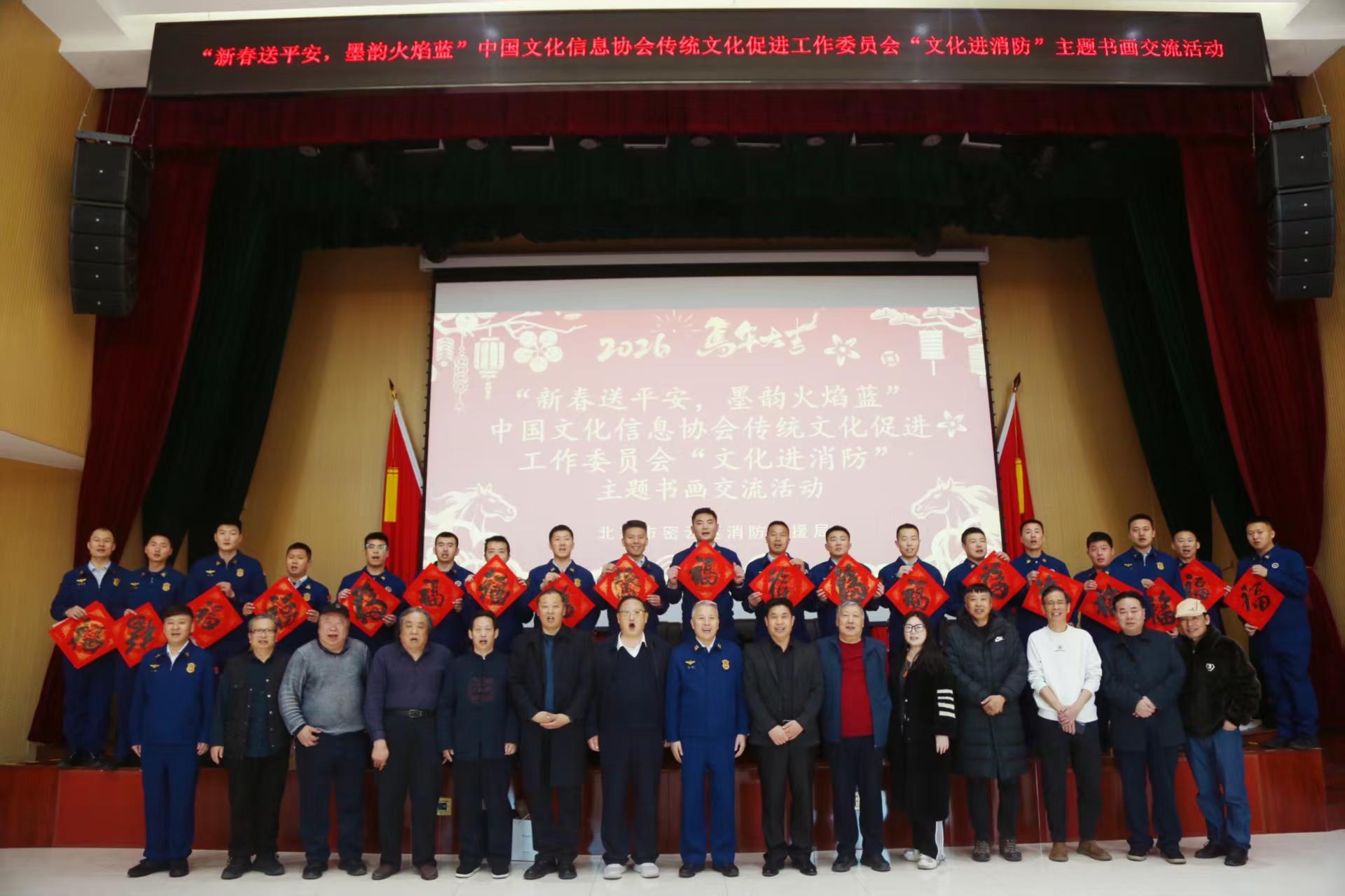 社区文化网讯(王清江 报道)在新春佳节即将到来之际,为弘扬中华民族传统文化,营造喜庆祥和的节日氛围,中国文化信息协会传统文化促进委员会走进密云区消防救援局,开展“新春送平安,墨韵火焰蓝”主题书画交流活动。密云区消防救援局王立政委致欢迎词,中国文化信息协会传统文化促进工作委员会郑秀才会长致新春慰问词,有10余位书画家现场挥毫献艺,创作各类书法、绘画作品100多幅赠送给消防指战员,向他们致以新春祝福和崇高敬意。