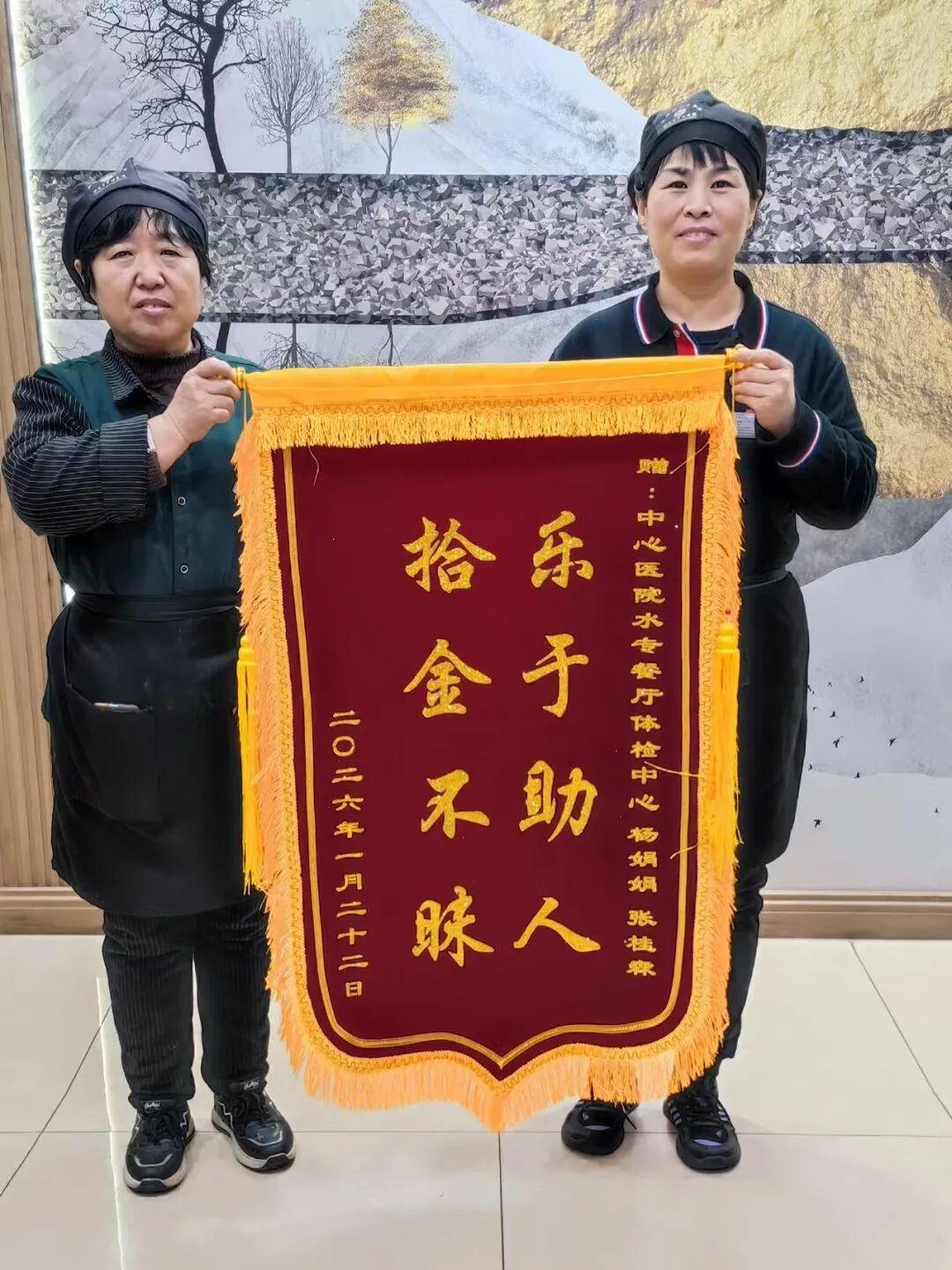 这份感动并未止于言谢。离开餐厅后,张女士拨打了12345便民服务热线,对中心医院餐饮事业科员工杨娟娟、张桂森拾金不昧主动归还的行为进行了表扬。1月26日,张女士又特意托朋友送来一面锦旗,感谢杨娟娟、张桂森。