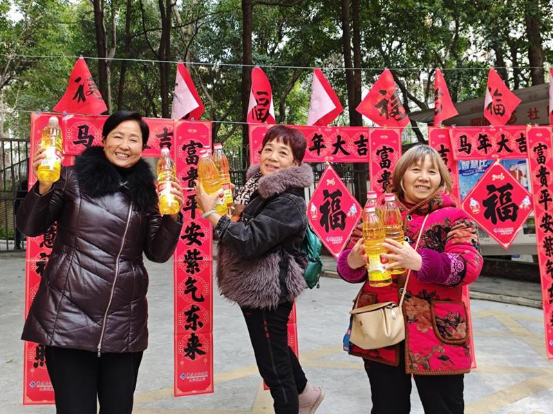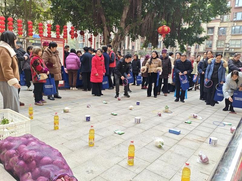 趣味互动区的蔬菜套圈环节同样人气爆棚,成为居民们争相参与的热门项目。工作人员将芹菜、萝卜、白菜、食用油等作为“奖品”整齐摆放,居民们手持套圈,瞄准目标、精准投掷,大人小孩轮番上阵,大家在轻松愉快的互动中增进了邻里情谊,收获了满满的欢乐与实惠。“这个套圈活动太有意思了,不仅能玩得开心,还能把新鲜蔬菜带回家,社区这个活动搞的太好了!”手拿刚刚领到食用油奖品的王阿姨笑得合不拢嘴,兴奋地与身边的邻里分享喜悦。