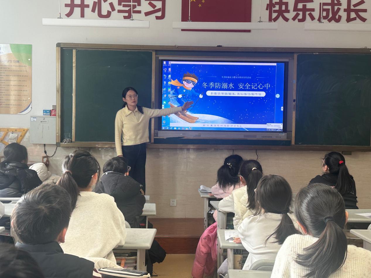 班会课上,班主任们结合冬季溺水事故的特点,通过播放警示视频、展示真实案例、讲解安全知识等多种形式,向学生们普及冬季防溺水的重要性。针对冬季河面、湖面易结冰的情况,老师们重点强调,严禁学生私自到冰面玩耍、滑冰,不随意靠近野外水塘、沟渠等危险区域;同时细致讲解冰面破裂落水后的自救方法,以及发现他人落水时的正确施救措施——要第一时间大声呼救、寻求成人帮助,切勿盲目下水施救。