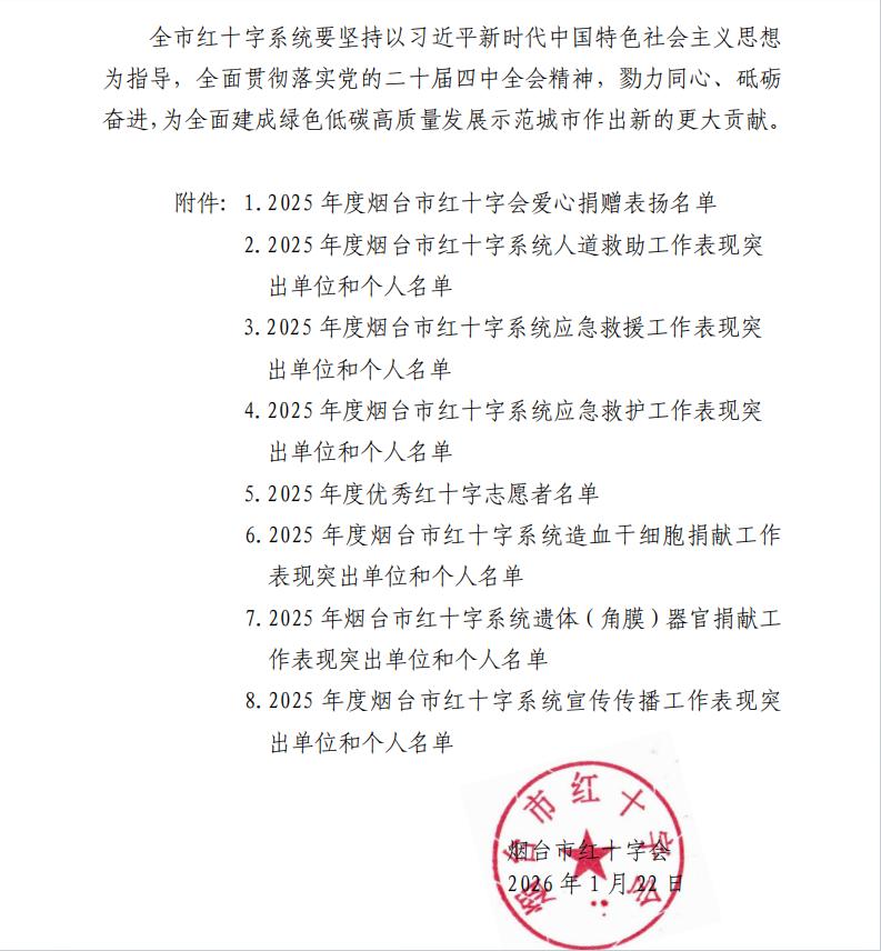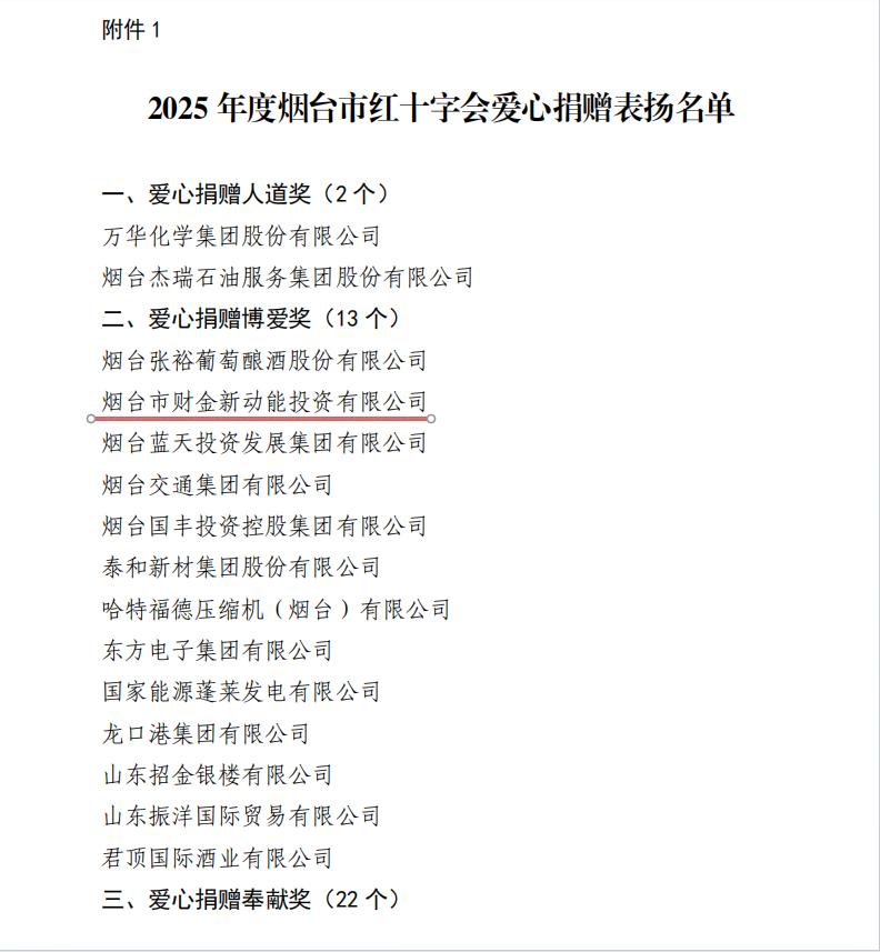 为大力弘扬“人道、博爱、奉献”的红十字精神,进一步激发烟台市各级各部门对红十字工作的积极性与主动性,近日,烟台市红十字会对2025年度突出表现的单位和个人进行通报表扬。烟台财金集团旗下财金新动能投资有限公司喜获2025年度烟台市红十字会“爱心捐赠博爱奖”。