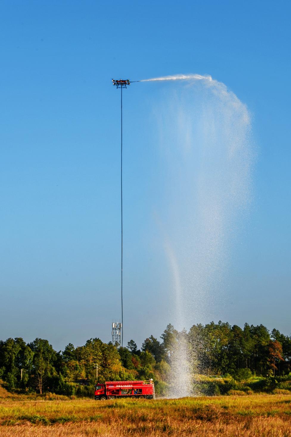 ▲首次亮相动态飞行表演的系留无人机消防车
