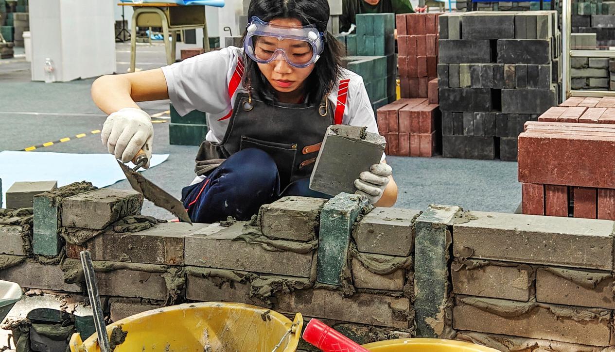 ▲4月15日,在湖南航空技师学院拍摄湖南省第二届职业技能大赛,图为砌筑赛场来自永州的女选手李婧。