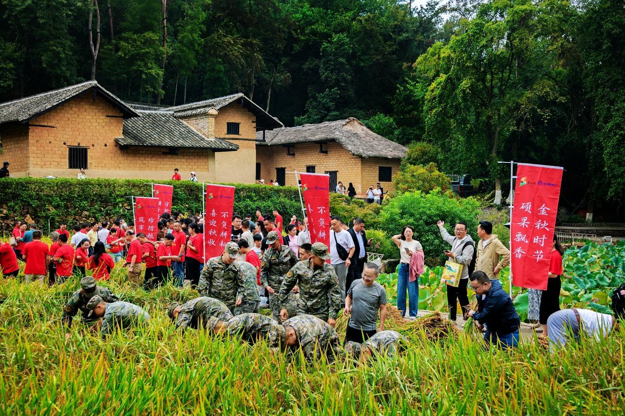 ▲9月29日,秋收时节,韶山冲的稻田里飘来阵阵稻香,金黄的稻谷成熟了。许多游客参与其中,体验收割的乐趣。