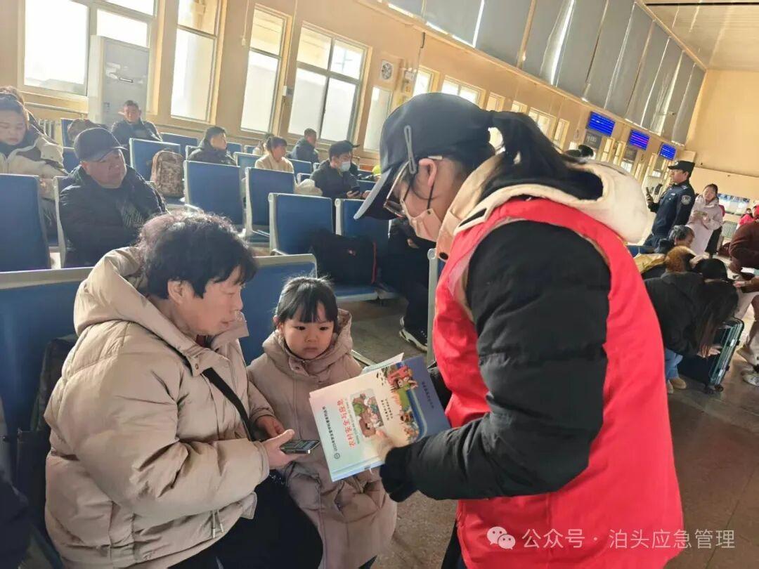 活动现场,工作人员与志愿者分工协作,向候车室乘客、周边群众发放交通安全知识、应急救灾常识、用电用气安全等各类宣传资料1500余份,用通俗易懂的语言现场讲解实用知识,耐心解答群众疑问,将安全提醒送至群众身边,引导群众增强安全防范意识,自觉遵守出行规则。