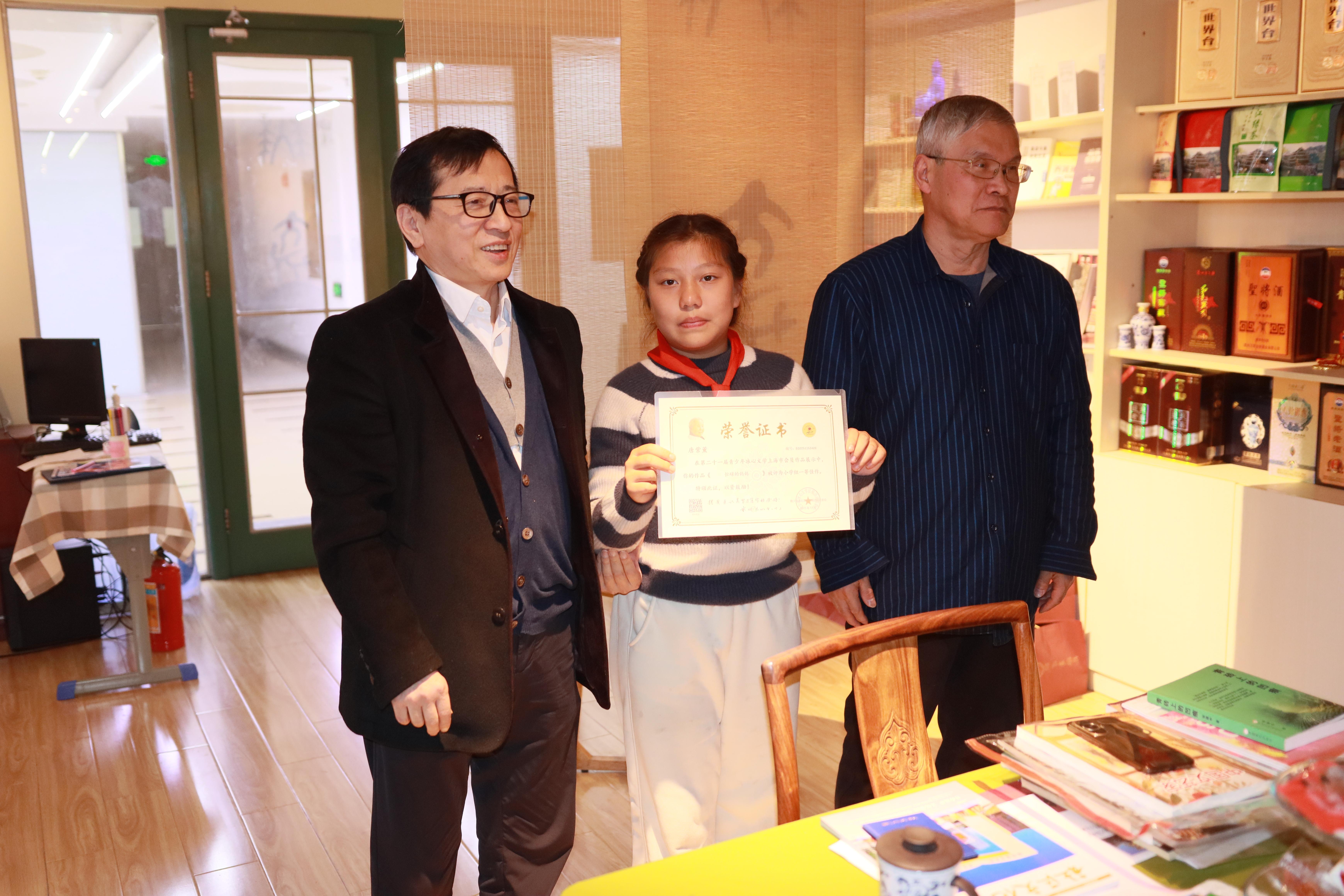 本次茶话会特设青少年文学表彰环节,对第二十一届青少年冰心少年文学上海市会员作品展示活动获奖选手进行现场颁奖。经过严格评审,小作者唐紫熏凭借作文《忙碌的妈妈》摘得小学组一等奖,作品以真挚情感、细腻笔触刻画亲情日常,展现出优秀的文字表达能力与生活观察能力。当代女作家刘迪为唐紫熏颁发冰心少年文学小记者证,邵惠民主任与李伟民主任共同为其颁发获奖证书,现场响起热烈掌声。颁奖后,唐紫熏现场朗读获奖作文《忙碌的妈妈》,童声清亮、情感真挚,生动展现少年儿童的文学天赋与家国情怀,赢得全体与会人员的一致赞许。