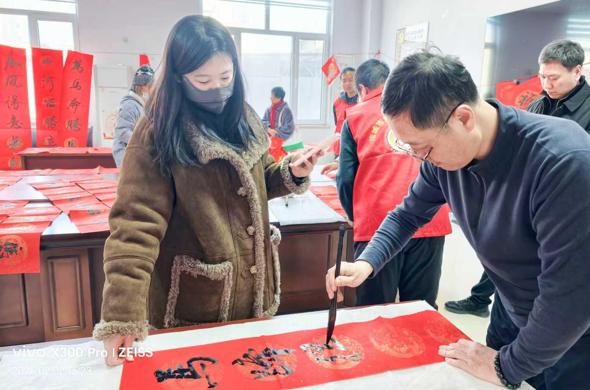 中银街社区的居民们也闻讯赶来,都想带几幅手写春联回家。运城市农民书画研究会张学智会长率先挥毫,墨迹如云,室内顿时盈满了纸香,气氛也随之活络开来,而后,大师们各自伏案笔走龙蛇。仝经书、任永智老师年过七十精神依然矍铄,落笔时凝神静气,横竖点捺皆端正从容,不见丝毫潦草;吕旭春、杨伟两位老师腕力沉厚,笔锋开阖间自见苍劲;张红霞主任挽起袖子,长联福字轮番的写以满足居民们的争相需求。