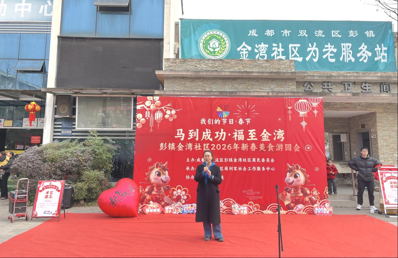 成都市双流区彭镇金湾社区党委副书记彭敏敏登台致辞,向全体居民致以最诚挚的新春祝福,祝愿大家在新的一年里阖家幸福、万事顺意、马到成功,简单真挚的话语赢得了现场居民的阵阵掌声。