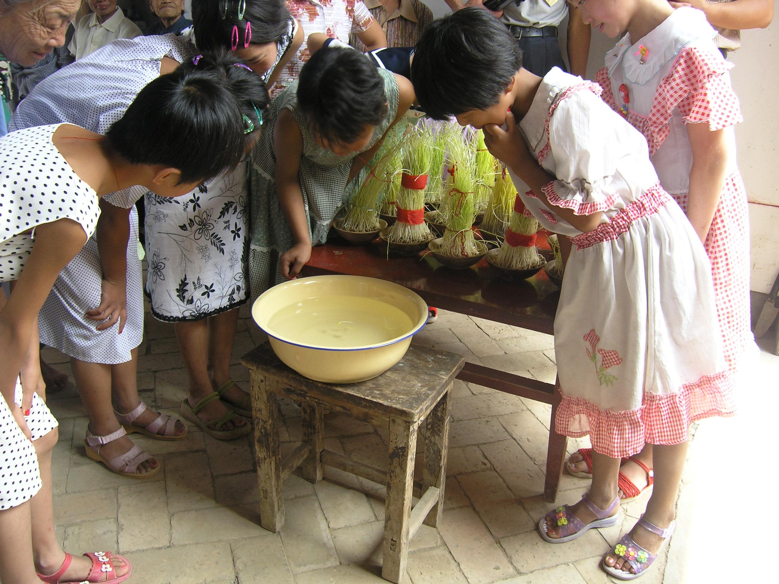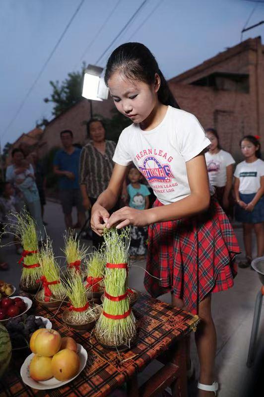 乞巧的独特韵味,更藏在那些精巧别致的细节里,让传统多了几分灵动与温情。六月初六天贶节,姑娘们便取大麦、小麦、豌豆等七色种子,以新井水泡于瓷碗,置于通风蔽日处悉心照料。待七夕之夜,芽苗已长至一两尺高,嫩茎肥叶、青翠欲滴,这便是承载着期许的“巧芽”。姑娘们将巧芽缠上红丝,虔诚供奉于织女像前比拼高低,芽高者便获“巧姑娘”的美誉,这份小小的荣耀,是对匠心最纯粹的嘉奖。而后掐一寸巧芽投于清水,静观其影形卜问巧拙:影如针、如线、如花,便是天生巧手,众人喝彩;影如椽、如檩,便被戏称为“笨姑娘”,一番欢声笑语,为乞巧添了几分俏皮与暖意。而“磨碗乞巧”更具韵味:四五人或八人围立,手持瓷碗两两相磨,清脆声响此起彼伏,姑娘们凝神静气、心无旁骛。若有人不慎昏昏欲睡,便引来众人善意的取笑;若有人能在喧闹中,下意识做出刺绣、织布、纺线的动作,便被尊为“巧女”“巧妇”,成为全场焦点。这比拼无关输赢,只为在协作互动中,传承那份对巧艺的敬畏与热爱。