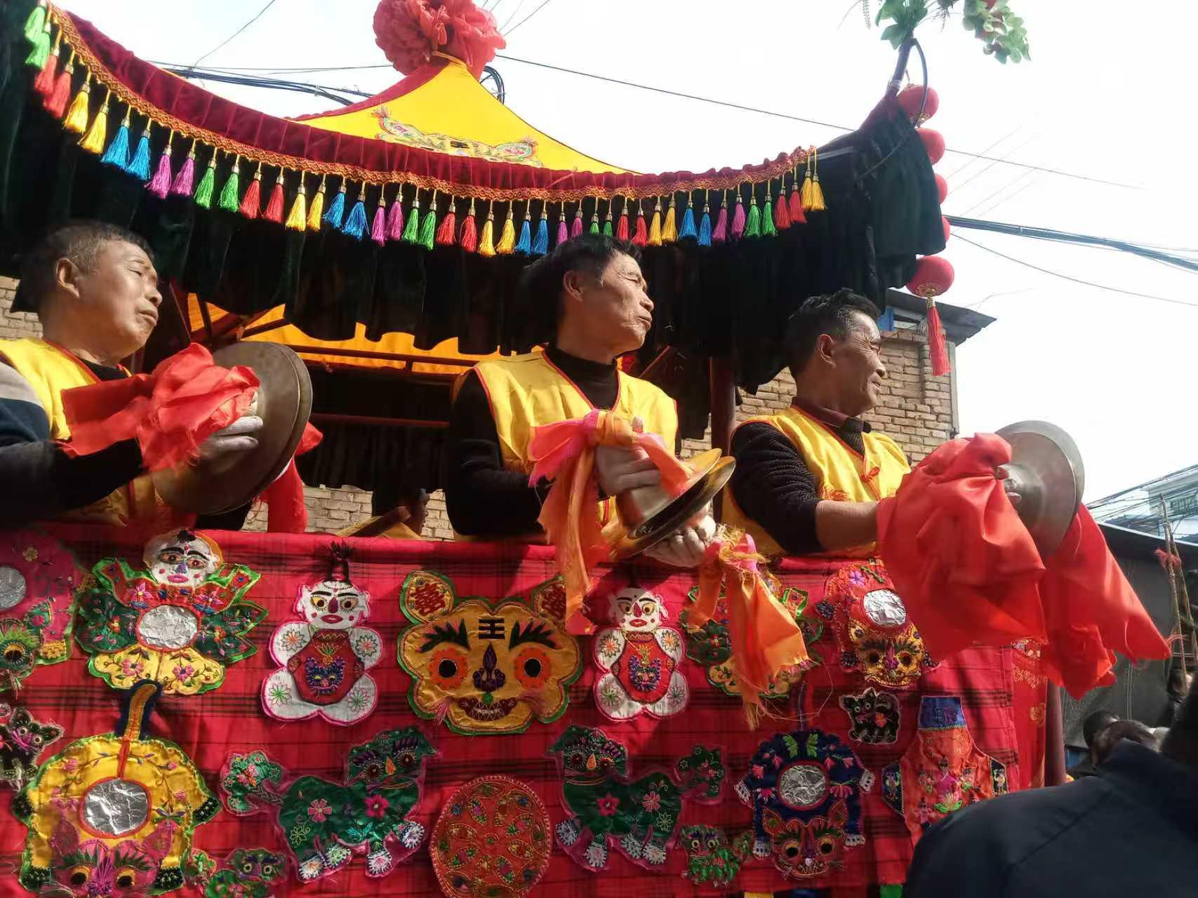 跑骡车的盛会,从来都是全村参与、万众齐心的大事。每年正月初五,新春的年味尚浓,阿寿村的百姓便已满怀热忱与期待,以村中各社为单位,开始紧锣密鼓筹划元宵节与二月二庙会的跑骡车表演。所有筹备事宜需先报经村委会商议同意,而后各村社的社火头便奔走相告、互通联络,分社分堡有序组织,若是村中有人对社火事宜稍显懈怠、未能积极响应,社里便会组织威风凛凛的锣鼓队,手持熊熊燃烧的火把登门“烧社火”。这独有的民俗方式,带着乡邻间的热切期许与淳朴的督促,也让跑骡车的筹备事宜愈发凝心聚力、万众一心。表演前夕,各社还需敲定骡车数量、划定出场与落场的场地、协调人员分工,事事周全、件件细致,方能让这场盛会圆满启幕。待到表演当日,跑骡车的队伍遵循着村中世代相传的规矩,依东南西北四社的顺序依次登场,严守“东起西落”的章法,一支支车队列队而出,气势如虹、步步生威。每一辆骡车,都需配备三匹至十二匹精壮矫健、训练有素的骡子,与之相配的,还有骑手、驾辕人、拉梢人、护辕人、开路人、栏头人等,再加上声势浩大的锣鼓队、手持火把的随行人员,每支骡车队伍的参与人数便有五十余人之多。而在长长的车队最后,还跟着专门的“拾路”人,他们一如古时战场上打扫战场的士卒,紧随车队身后,将沿途的杂物清理妥当,这份细致的安排,既藏着民俗里的老规矩,也透着沙苑人的淳朴与周全。参与跑骡车表演的所有人员,皆身着色彩艳丽、纹样精美的民族服饰,头上系着大红绸带迎风舒展,身上挂着清脆的铜铃,行走间铃音叮当,喜庆又热烈。而那些威风凛凛的骡子,更是装扮得格外亮眼:头顶系着大红绸花,嘴间戴着精致的五花岔子,身躯之上同样挂满铜铃,每一步奔跃,都有铃音阵阵、声声悦耳。那承载着所有风采与匠心的花车,更是巧夺天工,民间匠人巧手将其精心装扮,或化作威风凛凛的古战船,或妆成精致华美的花轿,刺绣、绸布、彩穗层层叠叠,五彩斑斓的彩饰迎风翻飞,一眼望去,流光溢彩、美不胜收,尽显民间手工技艺的精妙。