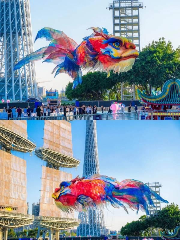 活动内容:日间为“吉庆巡游”,鳌鱼与国潮鱼龙舞共同表演,期间还设有游客互动游戏与礼品派发环节;夜间为“炽焰共舞”,先由鳌鱼进行暖场巡游,随后移至舞台处,配合震撼的火秀表演。